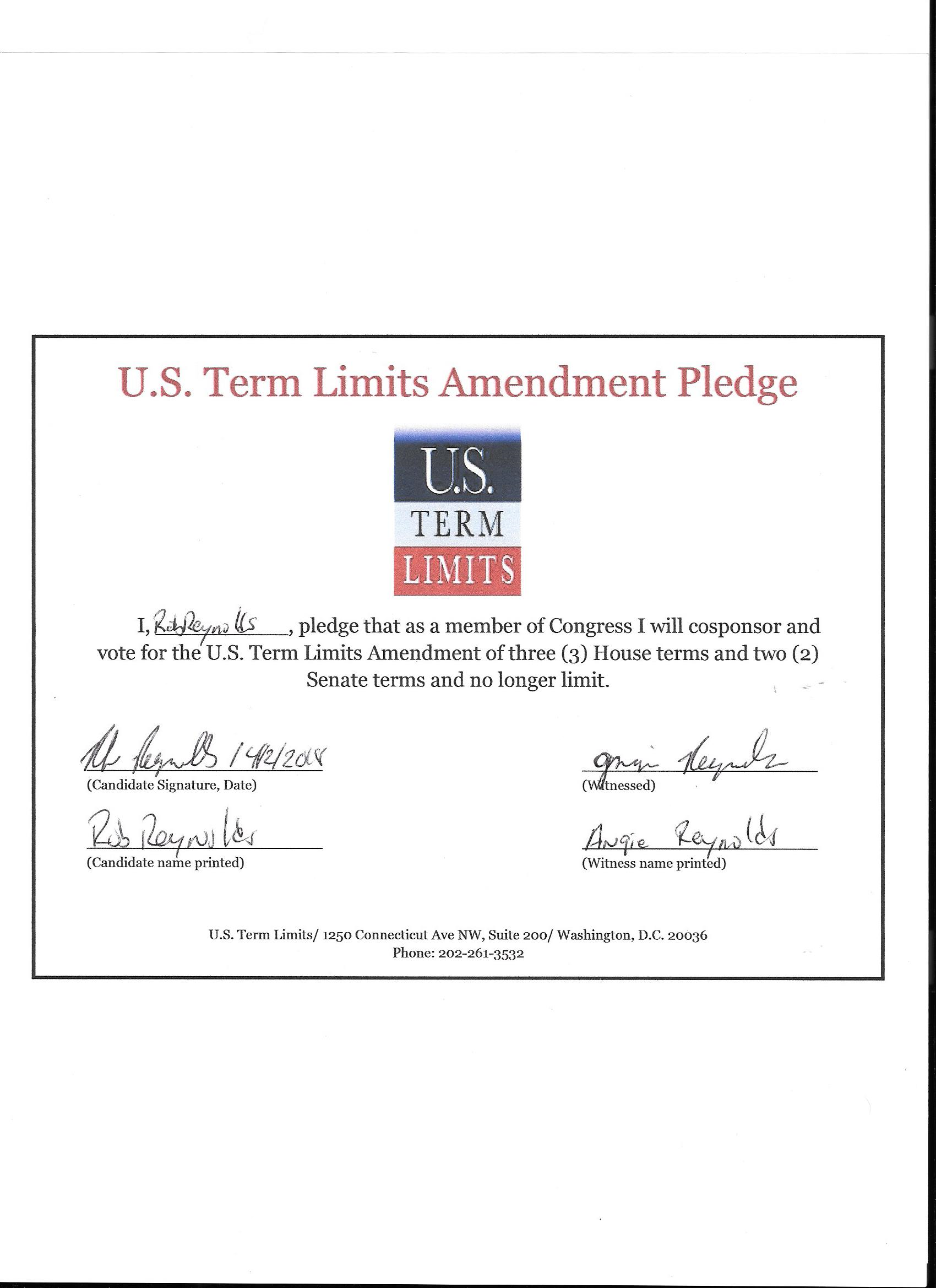 Washington, D.C. – U.S. Term Limits (USTL), the leader in the national movement to limit terms for elected officials, today praised Oregon U.S. House CD-5 candidate, Rob Reynolds, for signing its congressional term limits pledge. Recently, Mark Callahan and Joey Nations pledged their commitment to support term limits on Congress as well.