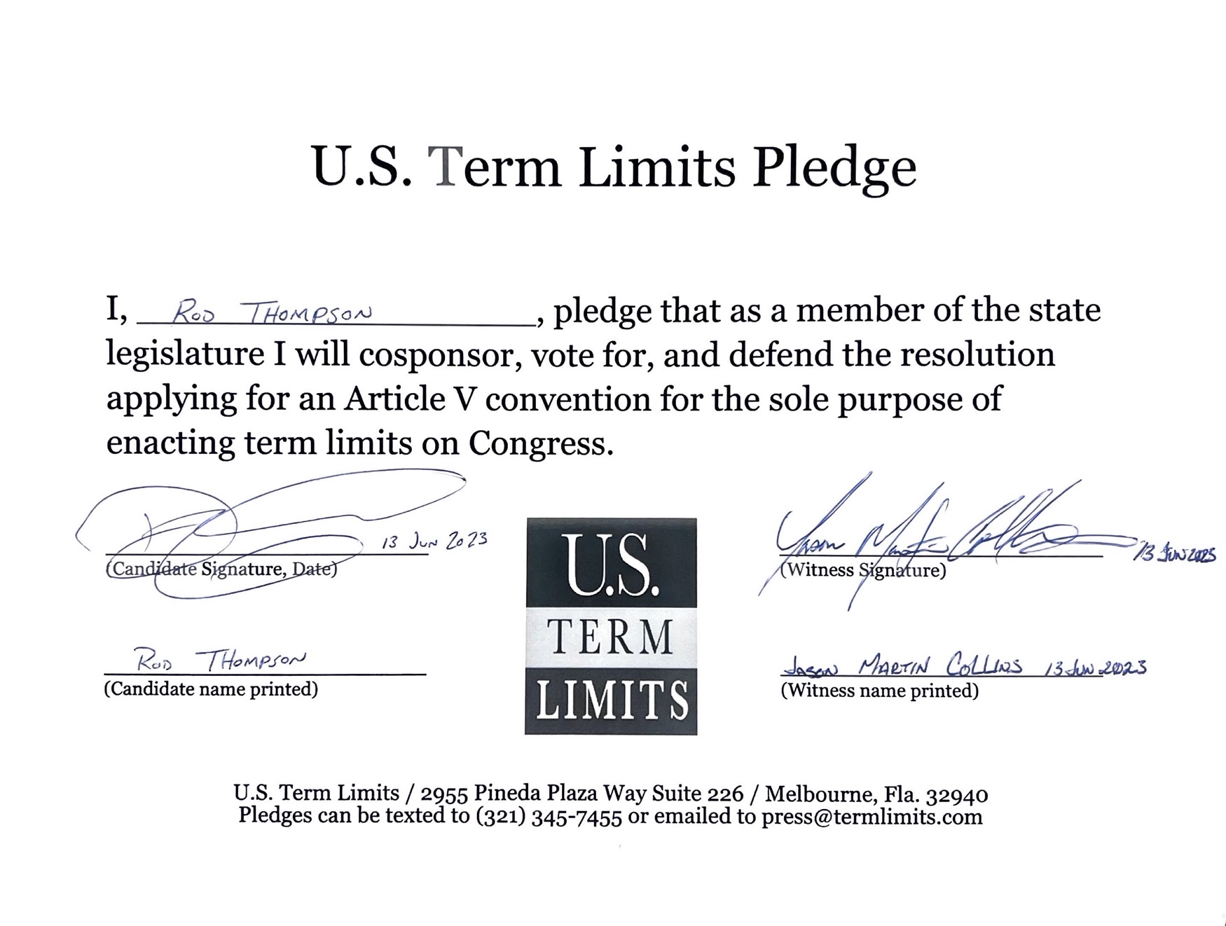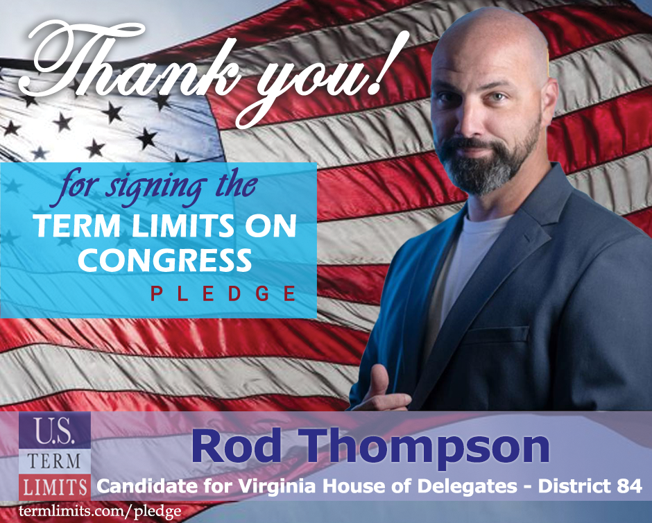 Suffolk, VA– U.S. Term Limits (USTL), the leader in the national, non-partisan movement to limit terms for elected officials, is gathering support from state lawmakers across the nation. Its mission is to get 34 states to apply for an amendment proposal convention specific to term limits on Congress. Virginia house of delegates candidate, Rod Thompson (district 84), has committed support for term limits on Congress by signing the Term Limits Convention pledge. Thompson is the first signer in this race. The primary election is scheduled for June 20, 2023.