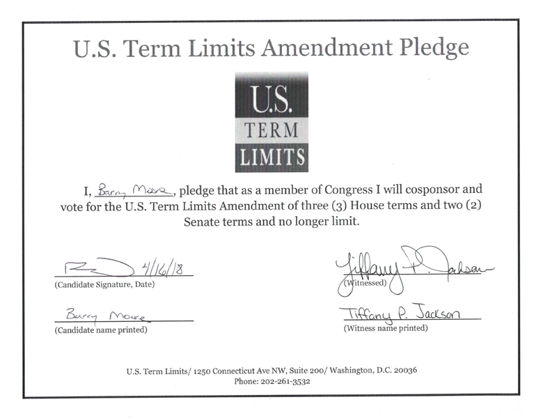 The U.S. Term Limits amendment pledge is provided to every announced candidate for federal office. It reads, “I pledge that as a member of Congress, I will cosponsor and vote for the U.S. Term Limits amendment of three (3) House terms and two (2) Senate terms and no longer limit.”