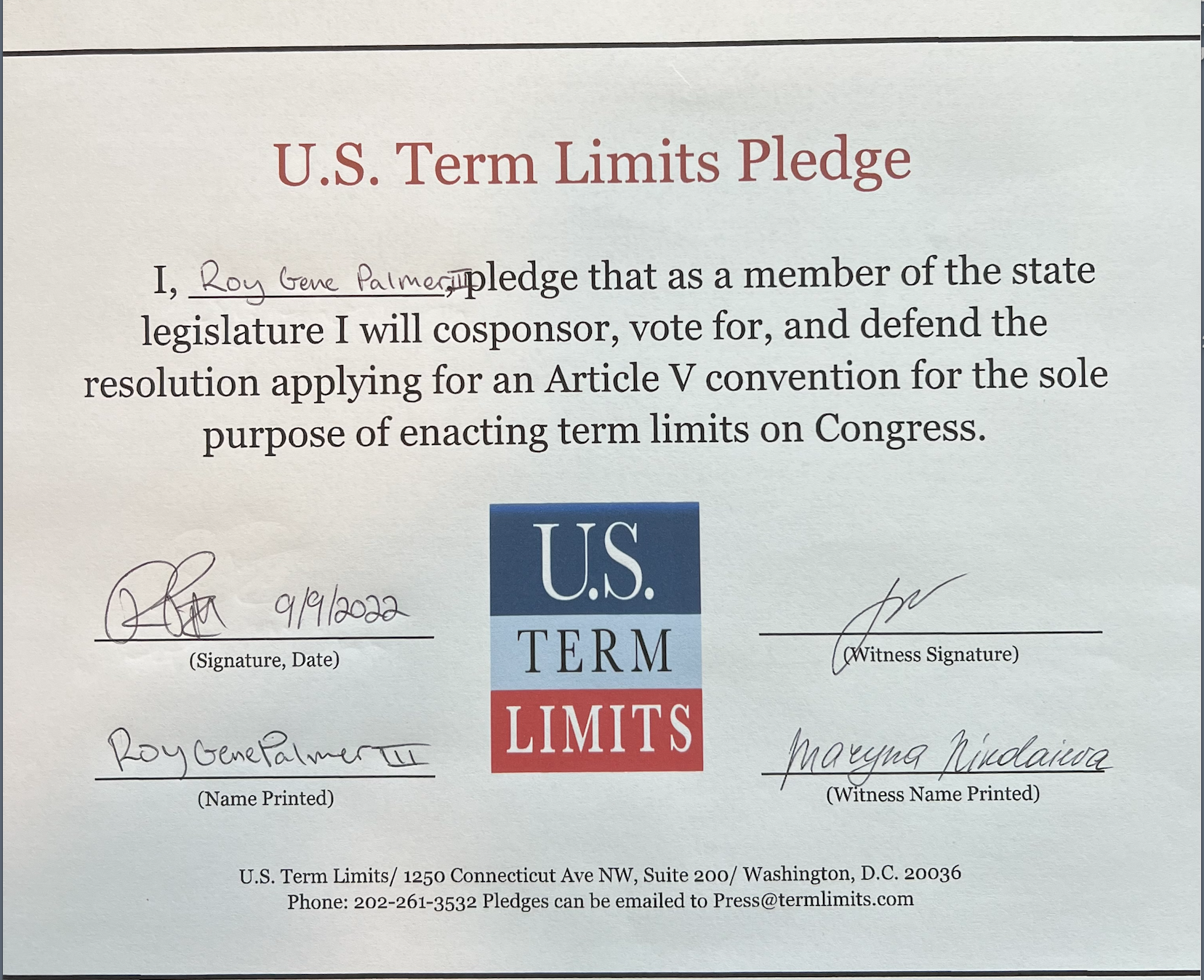 Roy Palmer III Pledges to Support Congressional Term Limits