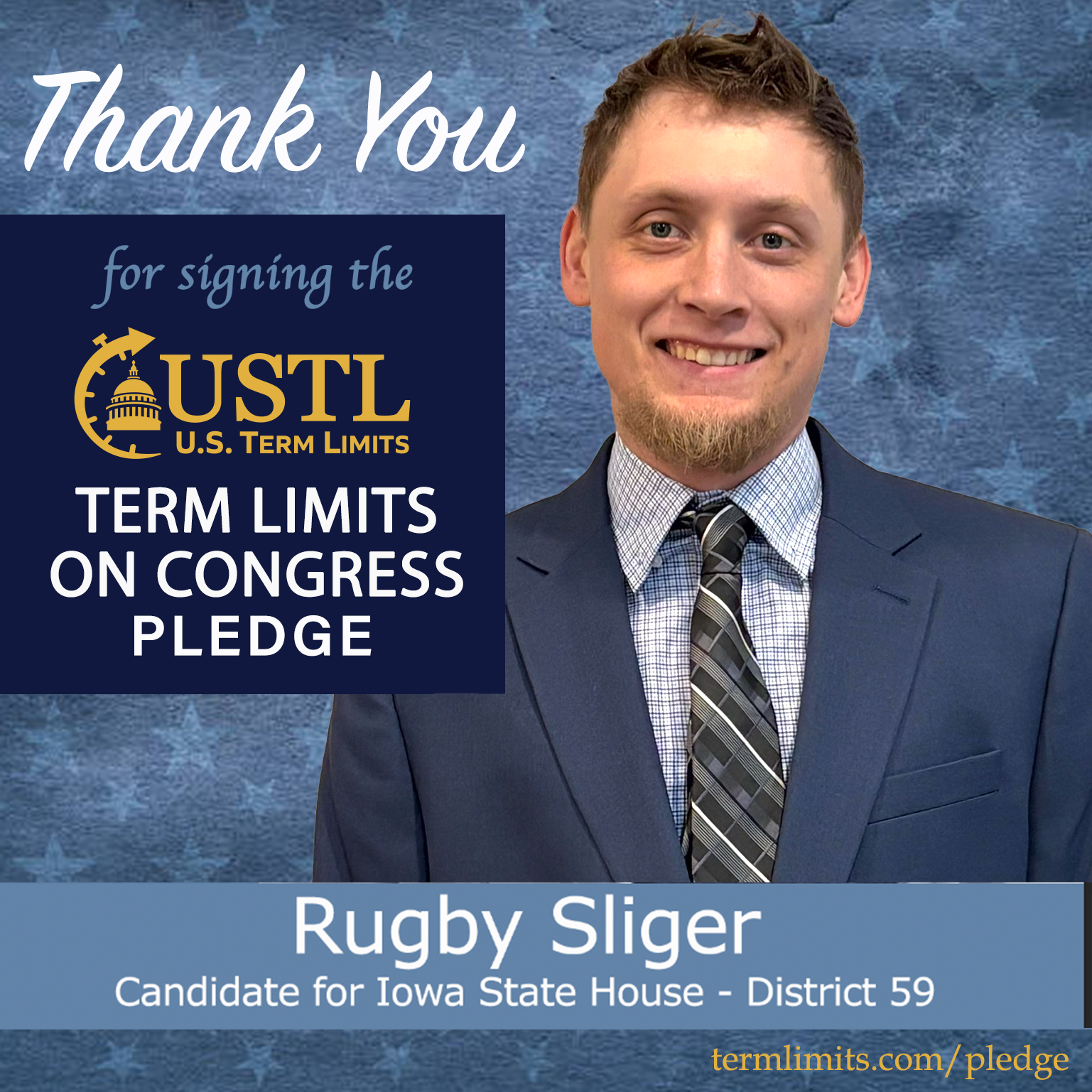 Cedar Rapids, IA – U.S. Term Limits (USTL), the leader in the national, non-partisan movement to limit terms for elected officials, is gathering support from state lawmakers across the nation. Its mission is to get 34 states to apply for an amendment proposal convention specific to term limits on Congress. 2026 Iowa state house candidate, Rugby Sliger (district 59), has committed support for term limits on Congress by signing the term limits convention pledge.