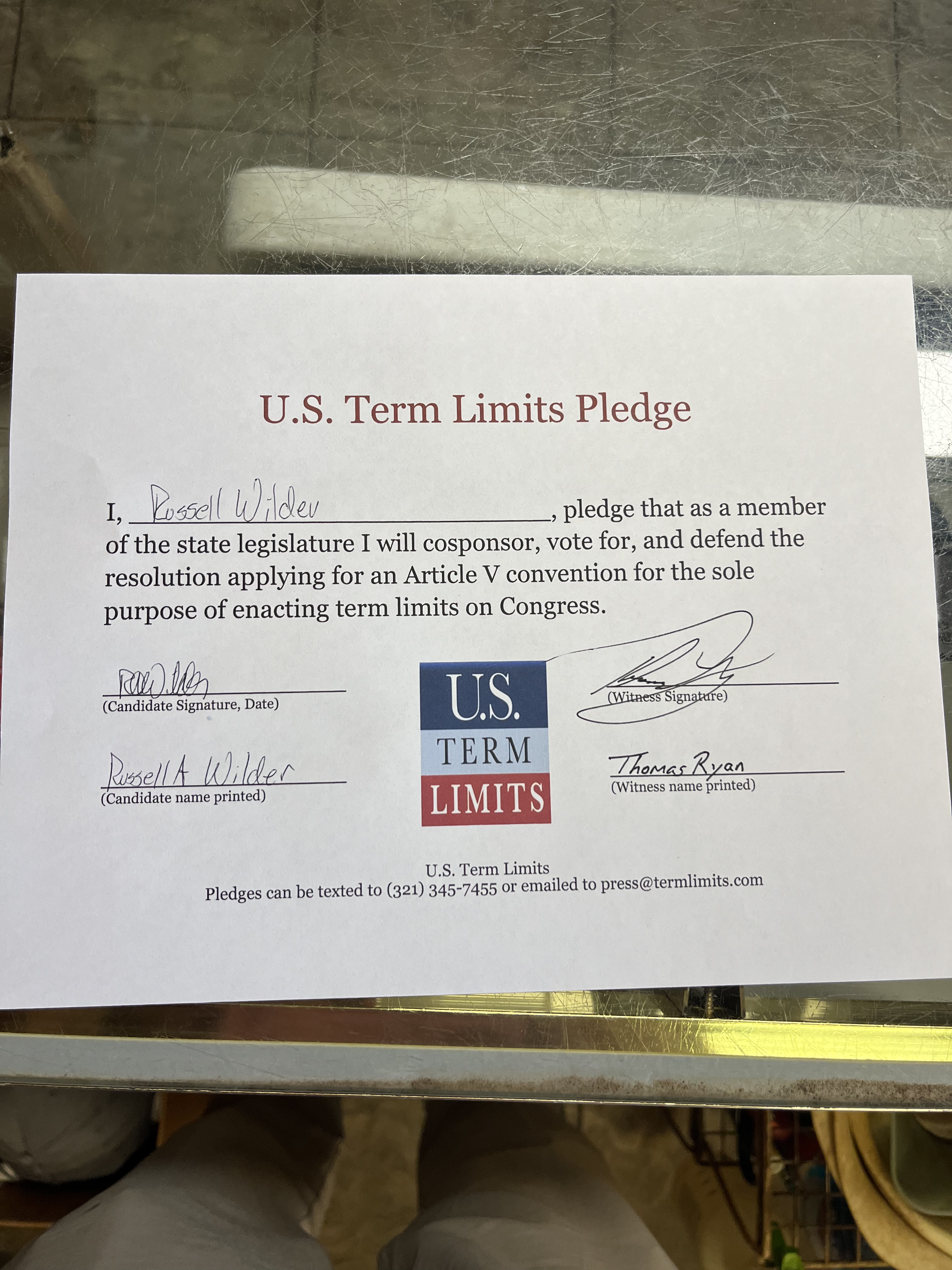 Evans, GA – U.S. Term Limits (USTL), the leader in the national, non-partisan movement to limit terms for elected officials, is gathering support from state lawmakers across the nation. Its mission is to get 34 states to apply for an amendment proposal convention specific to term limits on Congress. Georgia state house candidate, Russell Wilder (District 131), has committed support for term limits on Congress by signing the Term Limits Convention Pledge. Wilder is the first signer in this race.