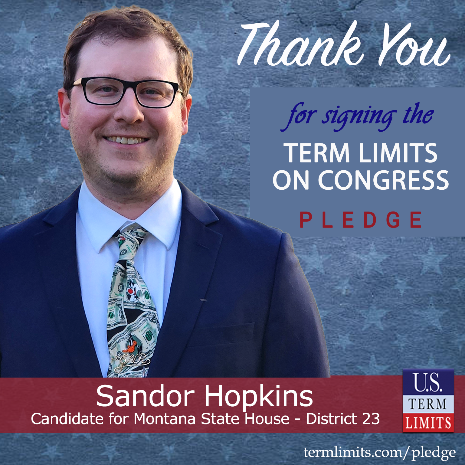 Great Falls, MT– U.S. Term Limits (USTL), the leader in the national, non-partisan movement to limit terms for elected officials, is gathering support from state lawmakers across the nation. Its mission is to get 34 states to apply for an amendment proposal convention specific to term limits on Congress. Montana state house candidate, Sandor Hopkins (district 23), has committed support for term limits on Congress by signing the term limits convention pledge.