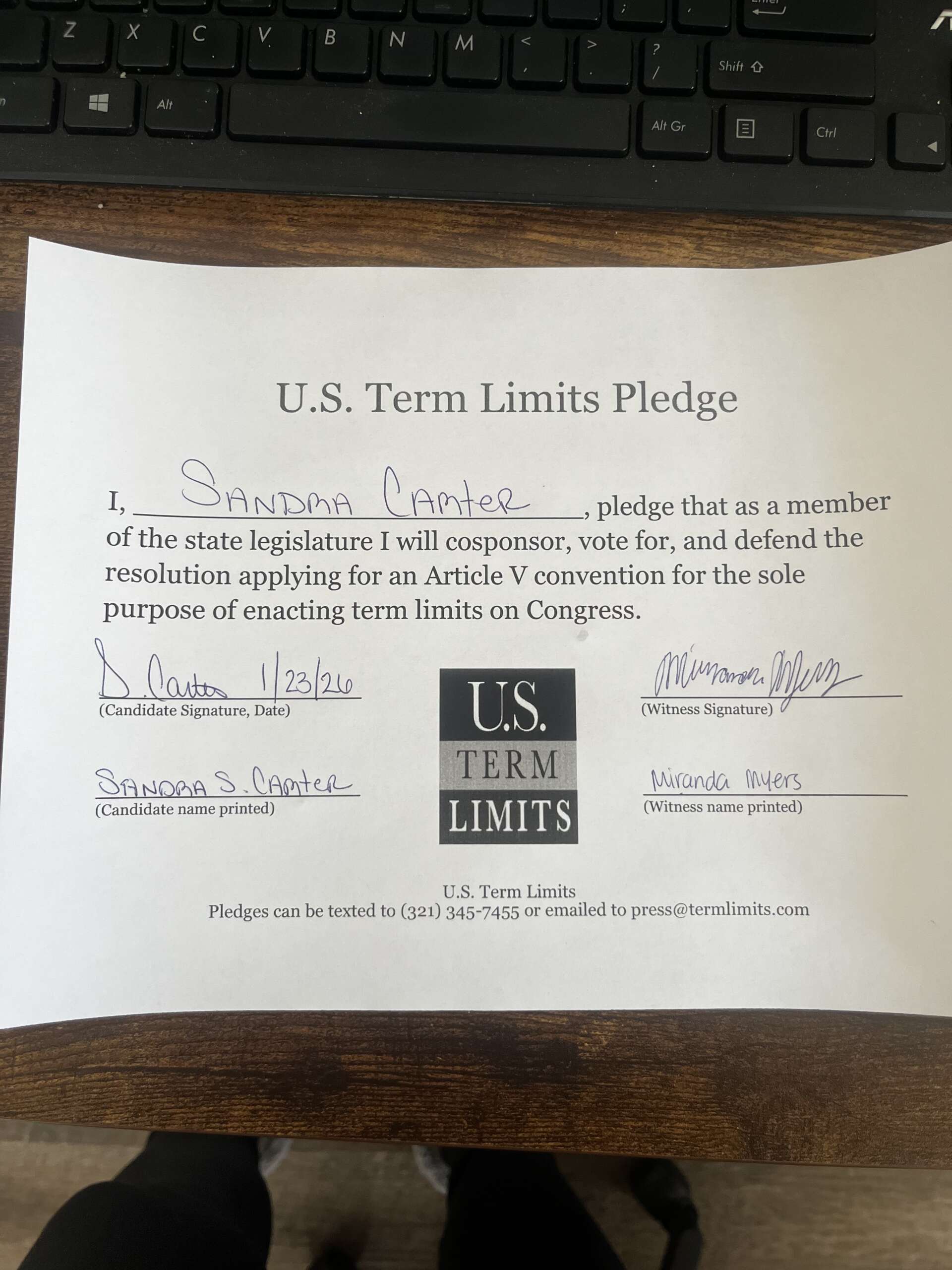 Sandra Carter Pledges to Support Congressional Term Limits