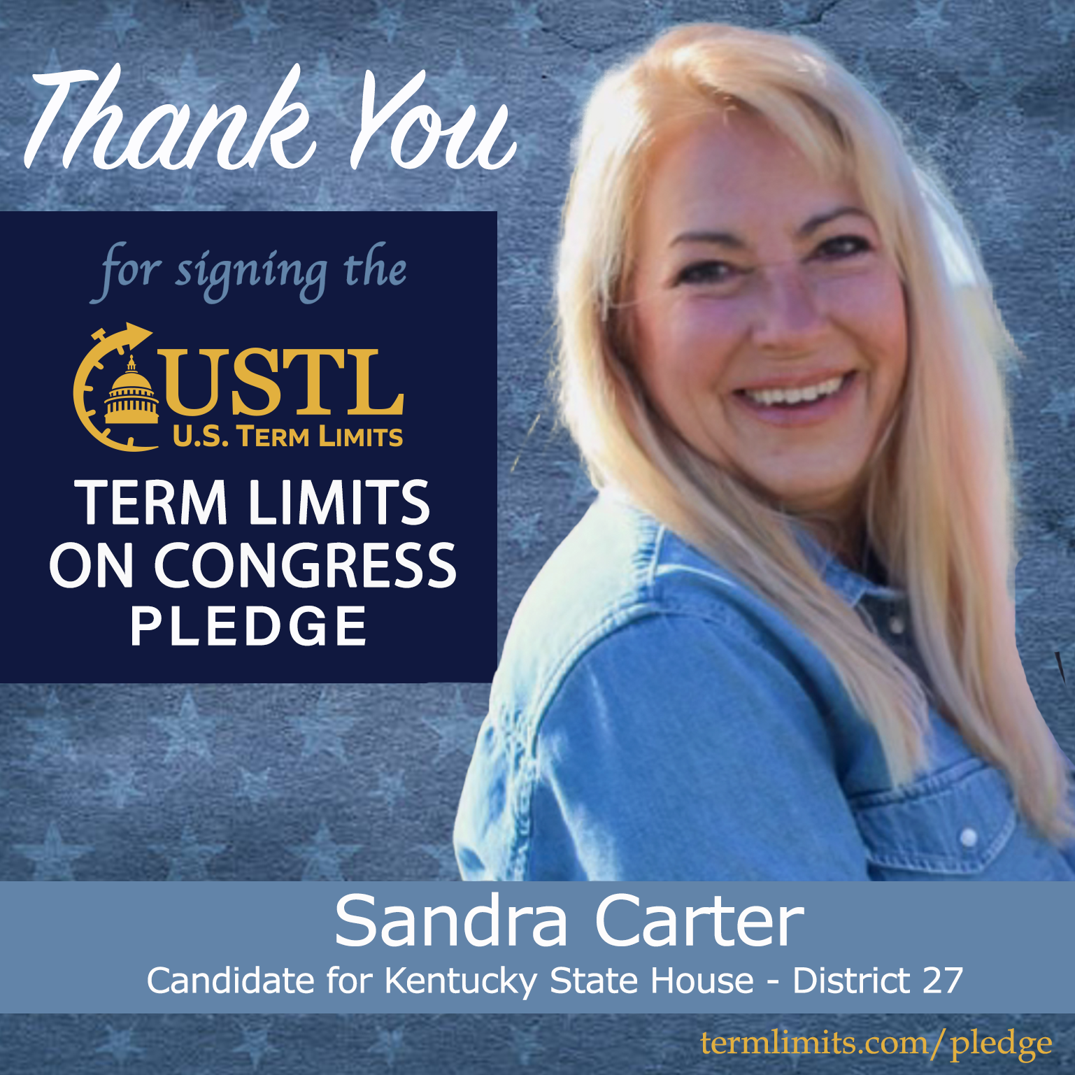 Ekron, KY – U.S. Term Limits (USTL), the leader in the national, non-partisan movement to limit terms for elected officials, is gathering support from state lawmakers across the nation. Its mission is to get 34 states to apply for an amendment proposal convention specific to term limits on Congress. Kentucky state house candidate, Sandra Carter (district 27), has committed support for term limits on Congress by signing the term limits convention pledge.