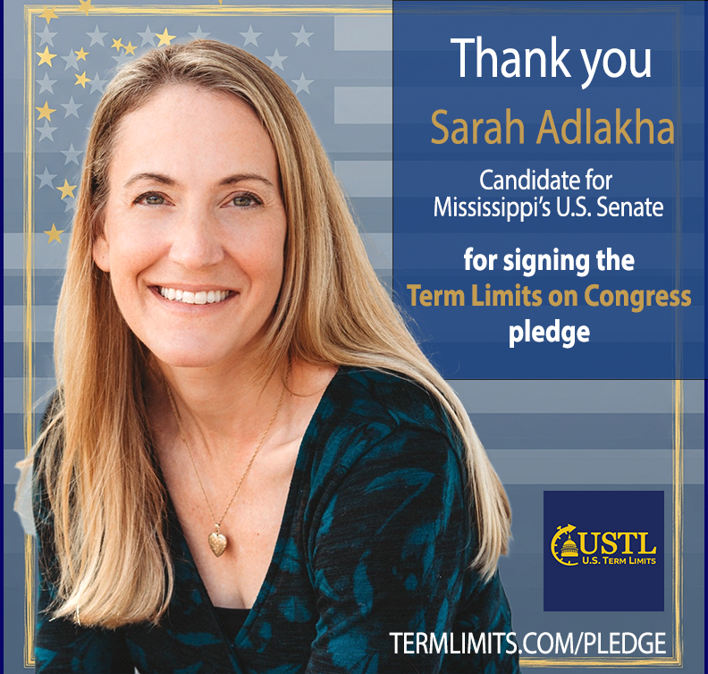 Washington D.C. – U.S. Term Limits (USTL), the leader in the non-partisan national movement to limit terms for elected officials, praises 2026 U.S. Senate candidate for Mississippi, Sarah Adlakha, for signing the pledge for an amendment to term limit Congress.