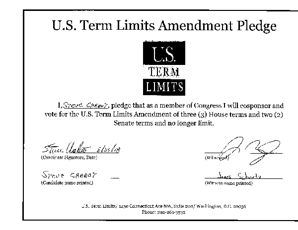 The U.S. Term Limits amendment pledge is provided to every announced candidate for federal office. It reads, “I pledge that as a member of Congress, I will cosponsor and vote for the U.S. Term Limits amendment of three (3) House terms and two (2) Senate terms and no longer limit.” The U.S. Term Limits constitutional amendment has been introduced in both the U.S. Senate by Senator Ted Cruz and his colleagues (SJR3) and the U.S. House by Representative Ralph Norman (HJR12).