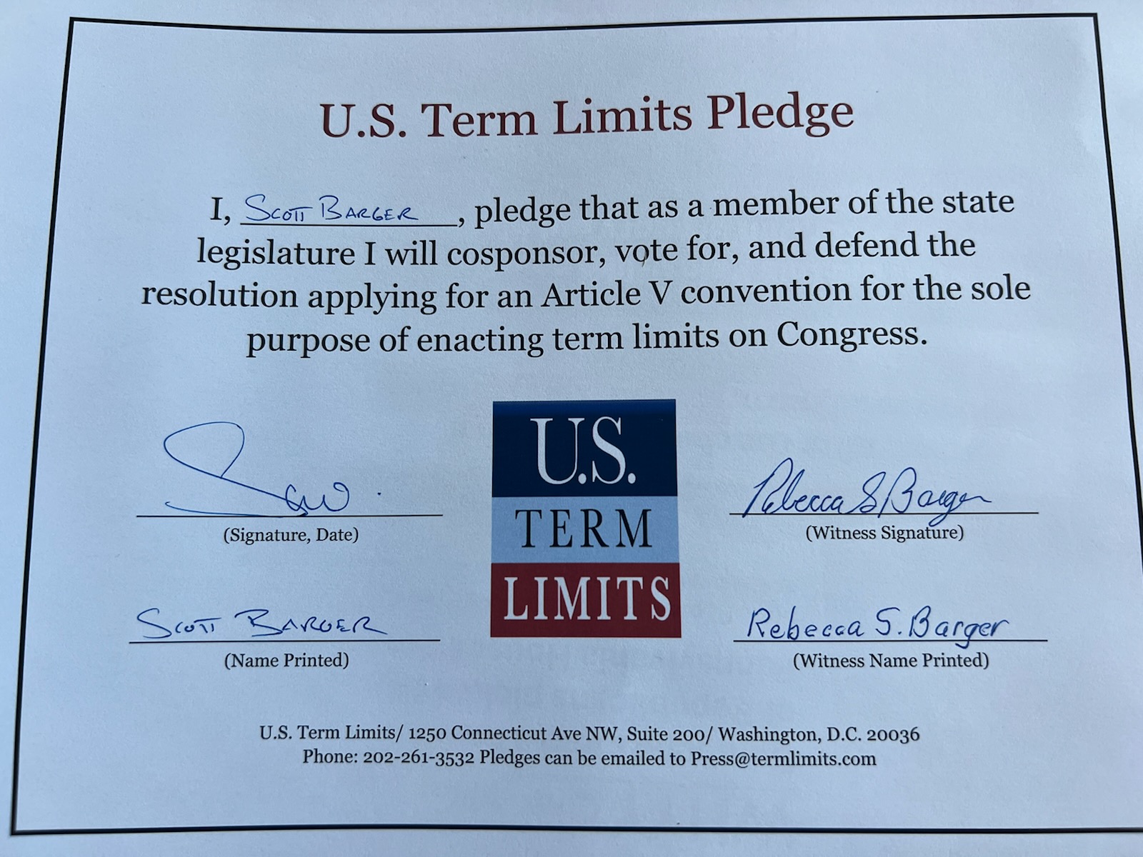 Scott Barger Pledges to Support Congressional Term Limits