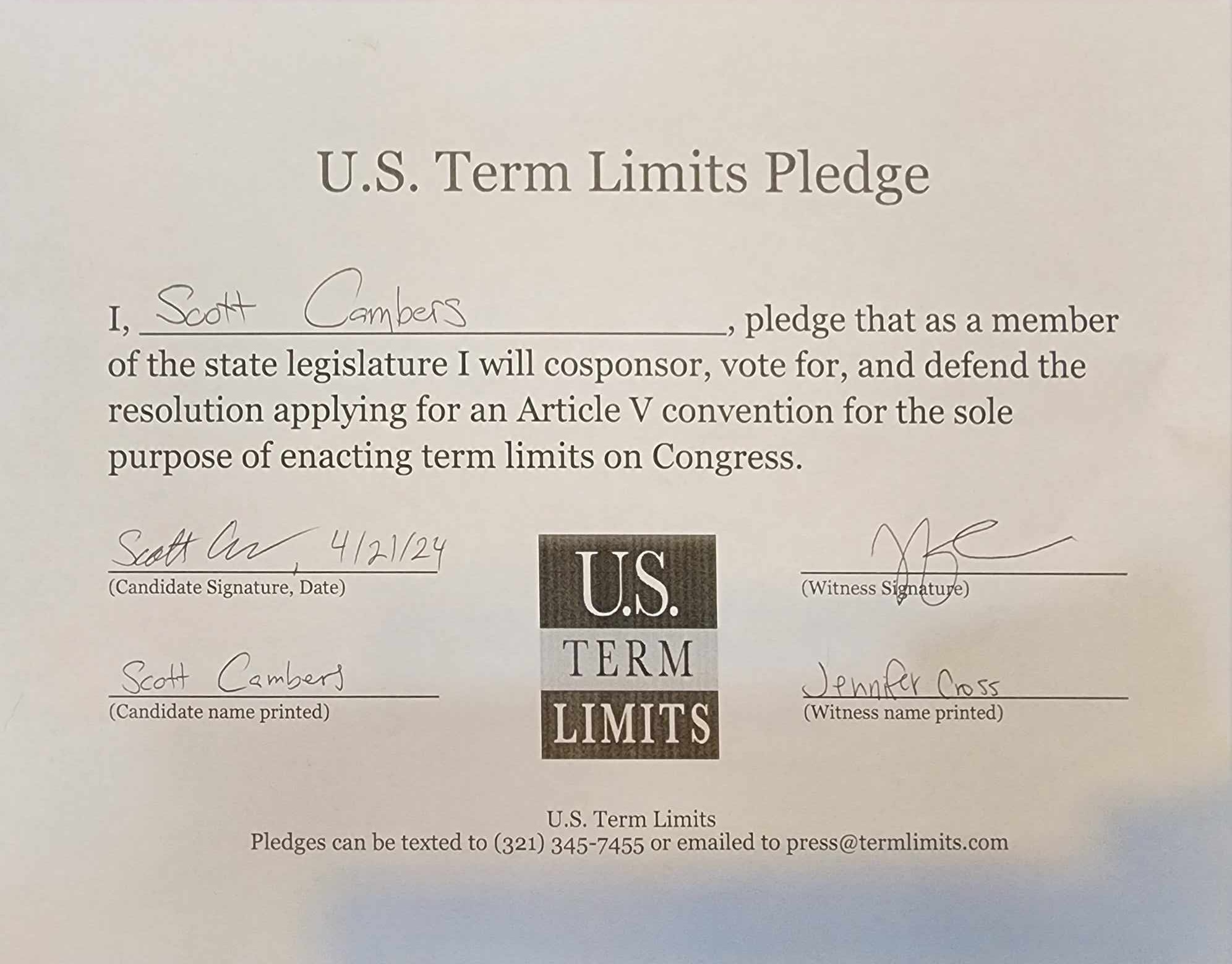 USTL President, Philip Blumel, commented on Cambers’s pledge saying, “Scott’s strong support of term limits shows that there are individuals who are willing to listen to the majority of voters who want term limits. America needs a Congress that will be served by citizen legislators, not career politicians.”