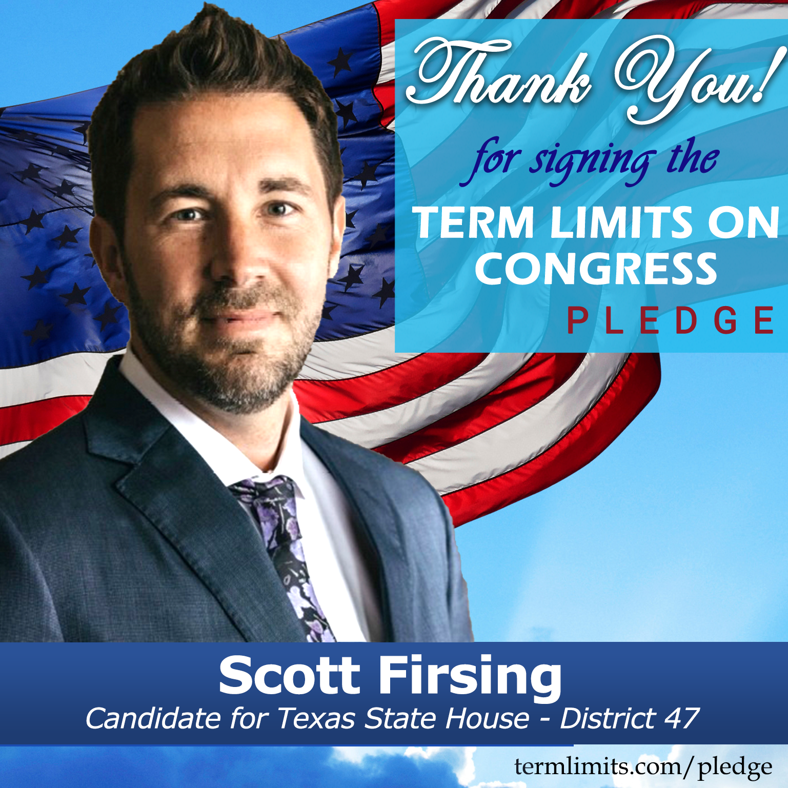 Austin, TX – U.S. Term Limits (USTL), the leader in the national, non-partisan movement to limit terms for elected officials, is gathering support from state lawmakers across the nation. Its mission is to get 34 states to apply for an amendment proposal convention specific to term limits on Congress. Texas state house candidate, Scott Firsing (District 47), has committed support for term limits on Congress by signing the Term Limits Convention Pledge. Firsing is the first signer in this race.