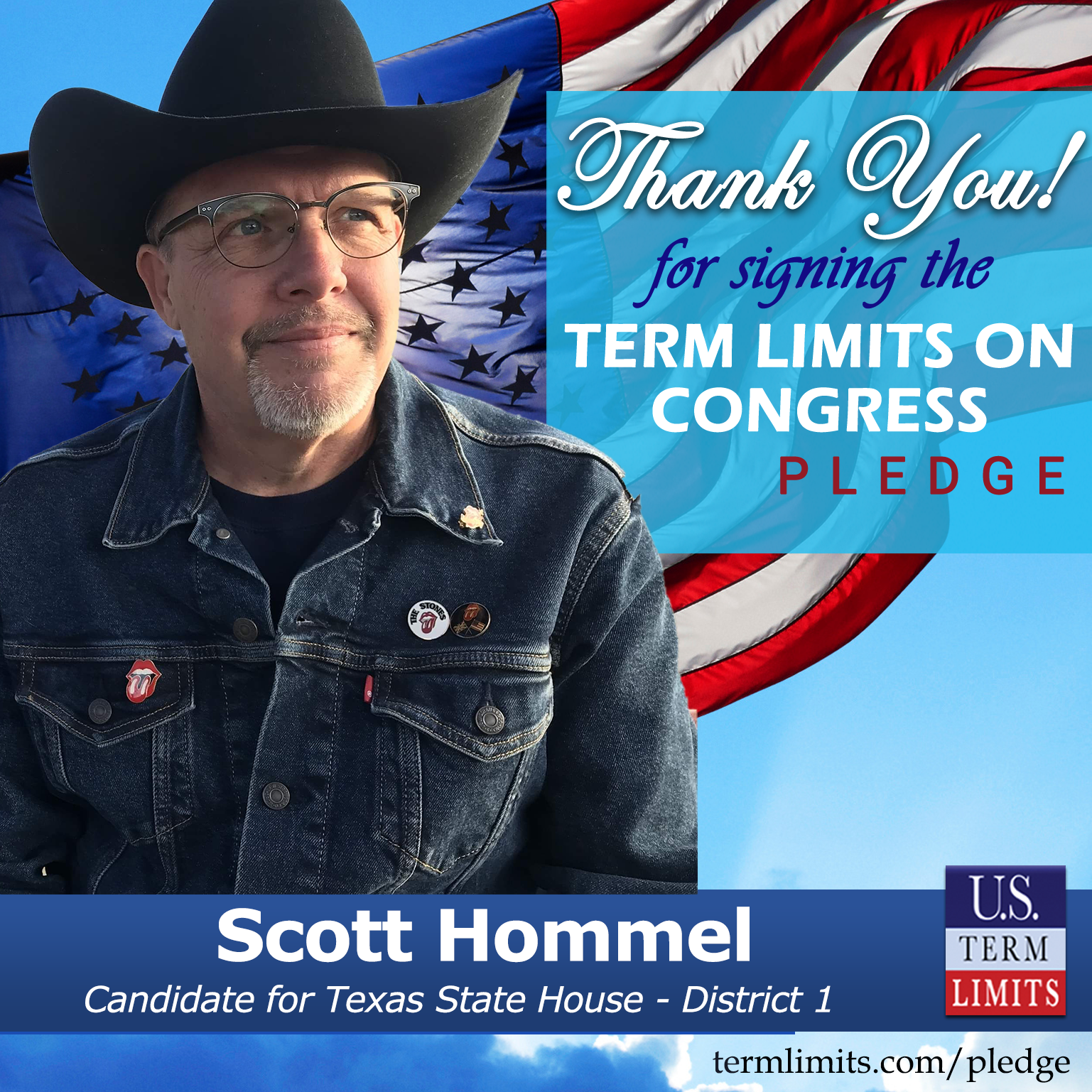 Clarksville, TX – U.S. Term Limits (USTL), the leader in the national, non-partisan movement to limit terms for elected officials, is gathering support from state lawmakers across the nation. Its mission is to get 34 states to apply for an amendment proposal convention specific to term limits on Congress. Texas state house candidate, Scott Hommel (District 1), has committed support for term limits on Congress by signing the term limits convention pledge. Previously, candidate Dale Huls also signed the pledge.