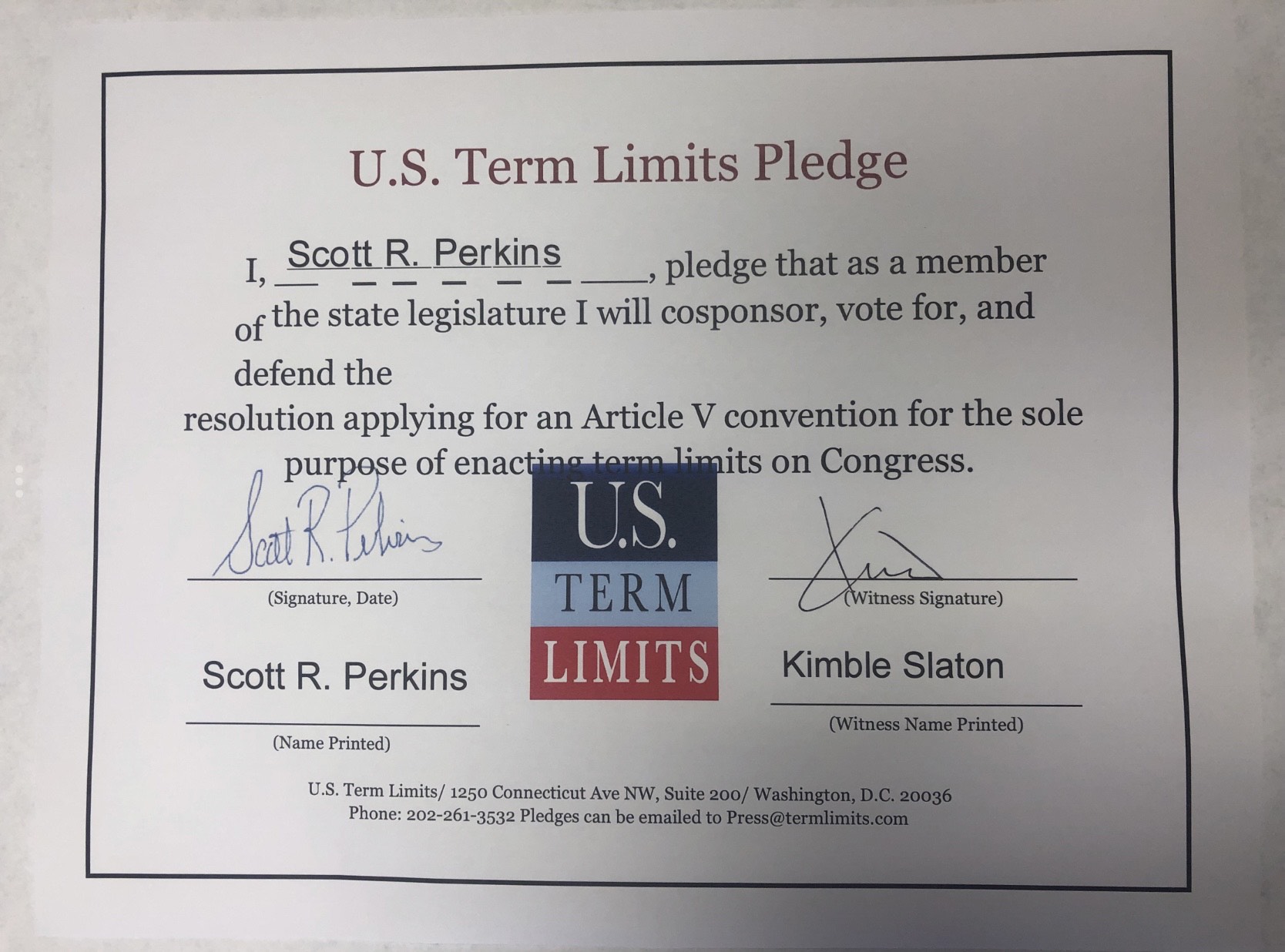 Wichita, KS – U.S. Term Limits (USTL), the leader in the national, non-partisan movement to limit terms for elected officials, is gathering support from state lawmakers across the nation. Its mission is to get 34 states to apply for an amendment proposal convention specific to term limits on Congress. Kansas state house candidate, Scott Perkins (district 30) has committed support for term limits on Congress by signing the Term Limits Convention pledge. Perkins is the first signer in this race.