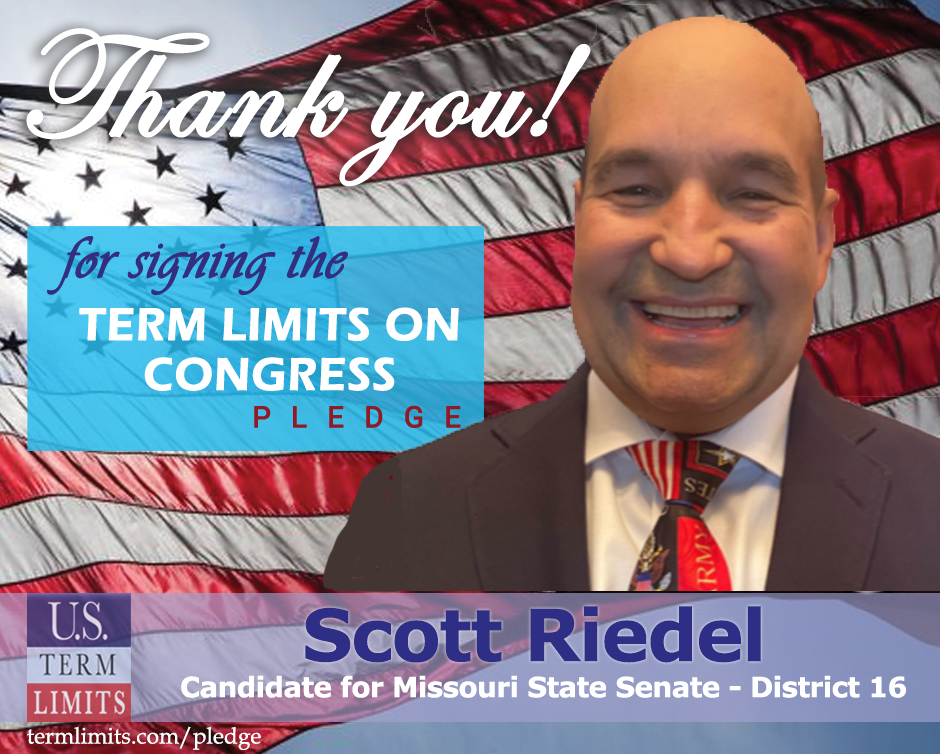 Fort Leonard Wood, MO – U.S. Term Limits (USTL), the leader in the national, non-partisan movement to limit terms for elected officials, is gathering support from state lawmakers across the nation. Its mission is to get 34 states to apply for an amendment proposal convention specific to term limits on Congress. Missouri state senate candidate, Scott Riedel (district 16) has committed support for term limits on Congress by signing the Term Limits Convention pledge. Riedel is the first signer in this race.