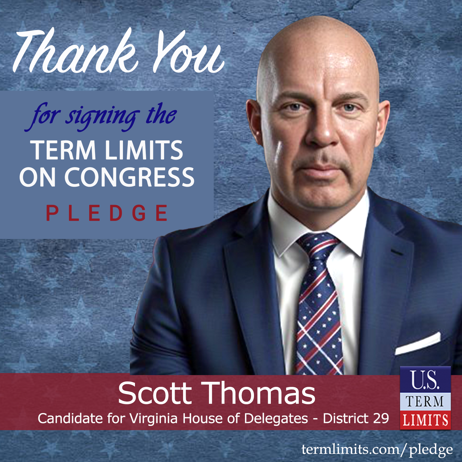 Leesburg, VA – U.S. Term Limits (USTL), the leader in the national, non-partisan movement to limit terms for elected officials, is gathering support from state lawmakers across the nation. Its mission is to get 34 states to apply for an amendment proposal convention specific to term limits on Congress. 2025 Virginia house of delegates candidate, Scott Thomas (district 29), has committed support for term limits on Congress by signing the term limits convention pledge. Thomas is the first signer in this race.
