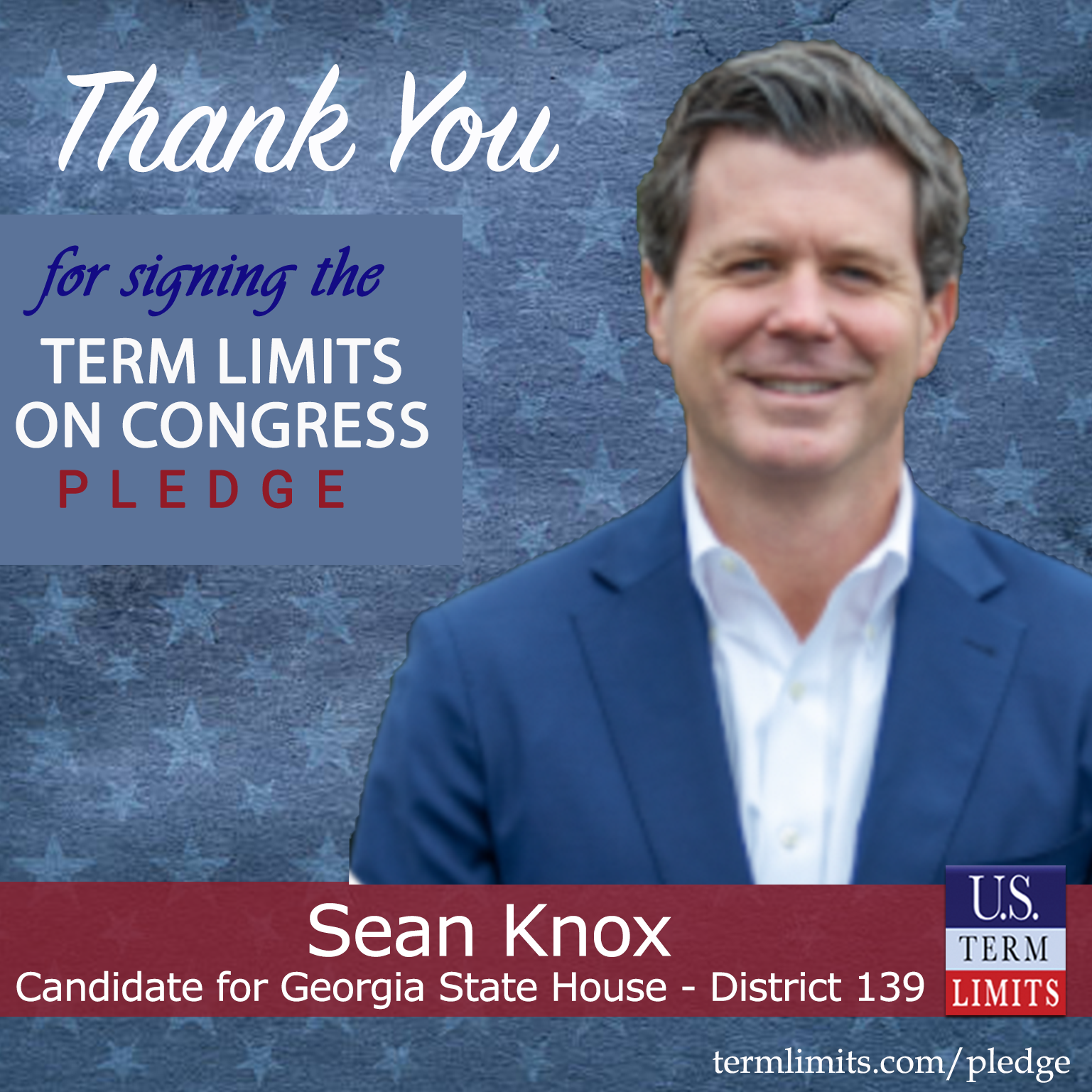 Atlanta, GA – U.S. Term Limits (USTL), the leader in the national, non-partisan movement to limit terms for elected officials, is gathering support from state lawmakers across the nation. Its mission is to get 34 states to apply for an amendment proposal convention specific to term limits on Congress. Georgia state house candidate, Sean Knox (District 139), has committed support for term limits on Congress by signing the term limits convention pledge. Knox is the first signer in this race.