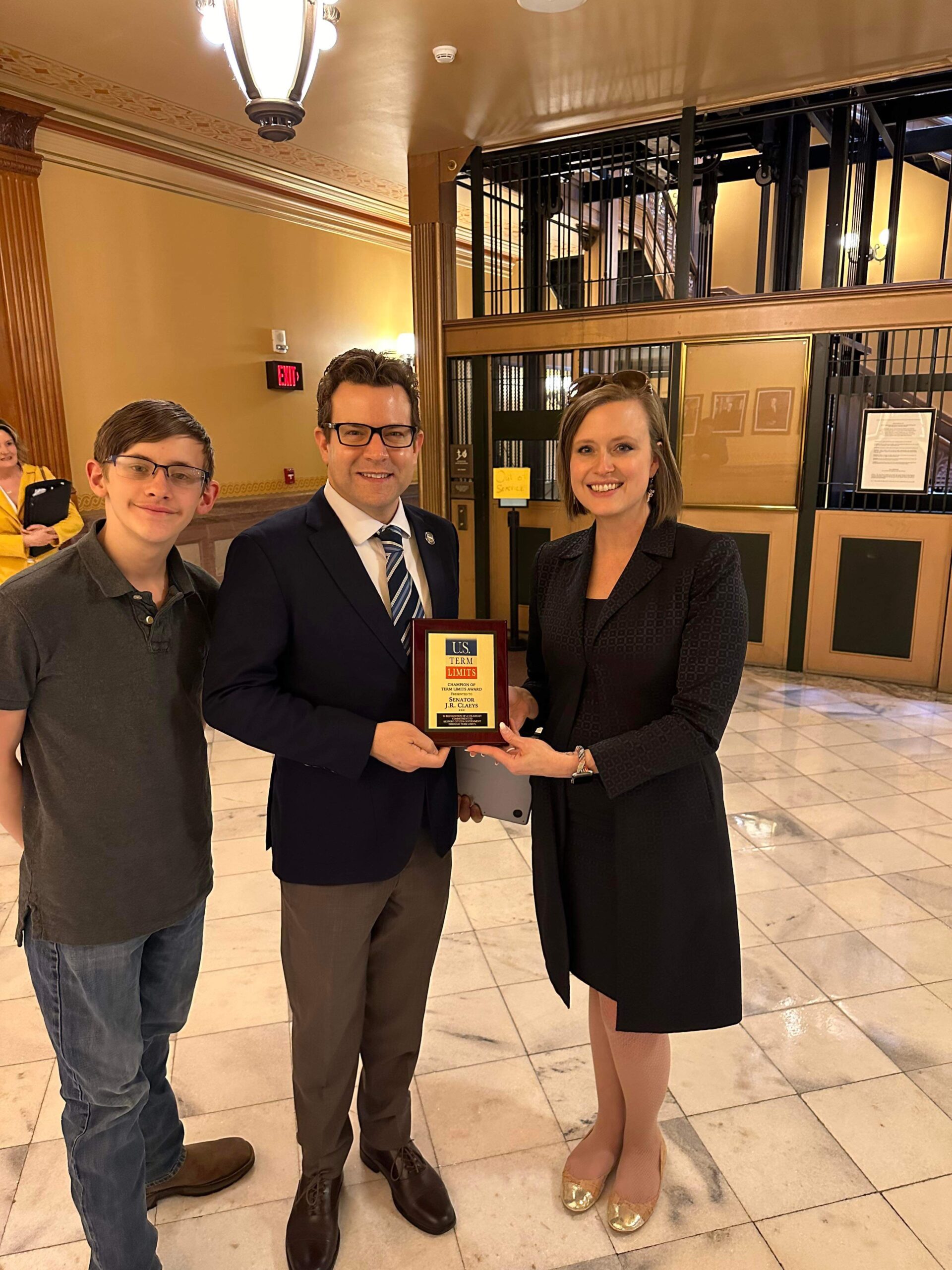 U.S. Term Limits presented Senator Claeys with the “Champion of Term Limits” plaque, which reads, “In recognition of a steadfast commitment to restore citizen government through term limits.” The U.S. Term Limits Article V convention application is limited to proposing an amendment to set a limit on the number of terms that a person may be elected as a member of the U.S. House and Senate. The Article V convention application does not specify the number of terms as that will be determined by the commissioners appointed to the convention by the state legislatures.