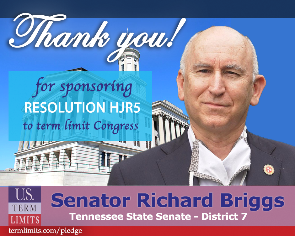 Nashville, TN – Tennessee State Senator Richard Briggs (District 7) has signed on as the Senate sponsor of House Joint Resolution 5 (HJR5). This resolution would have Tennessee join other states in calling for a convention for proposing a congressional term limits amendment to the U.S. Constitution. The measure passed the State House earlier this year with Rep. Chris Todd as sponsor. The effort is being spearheaded by the nonpartisan, nonprofit, U.S. Term Limits (USTL).