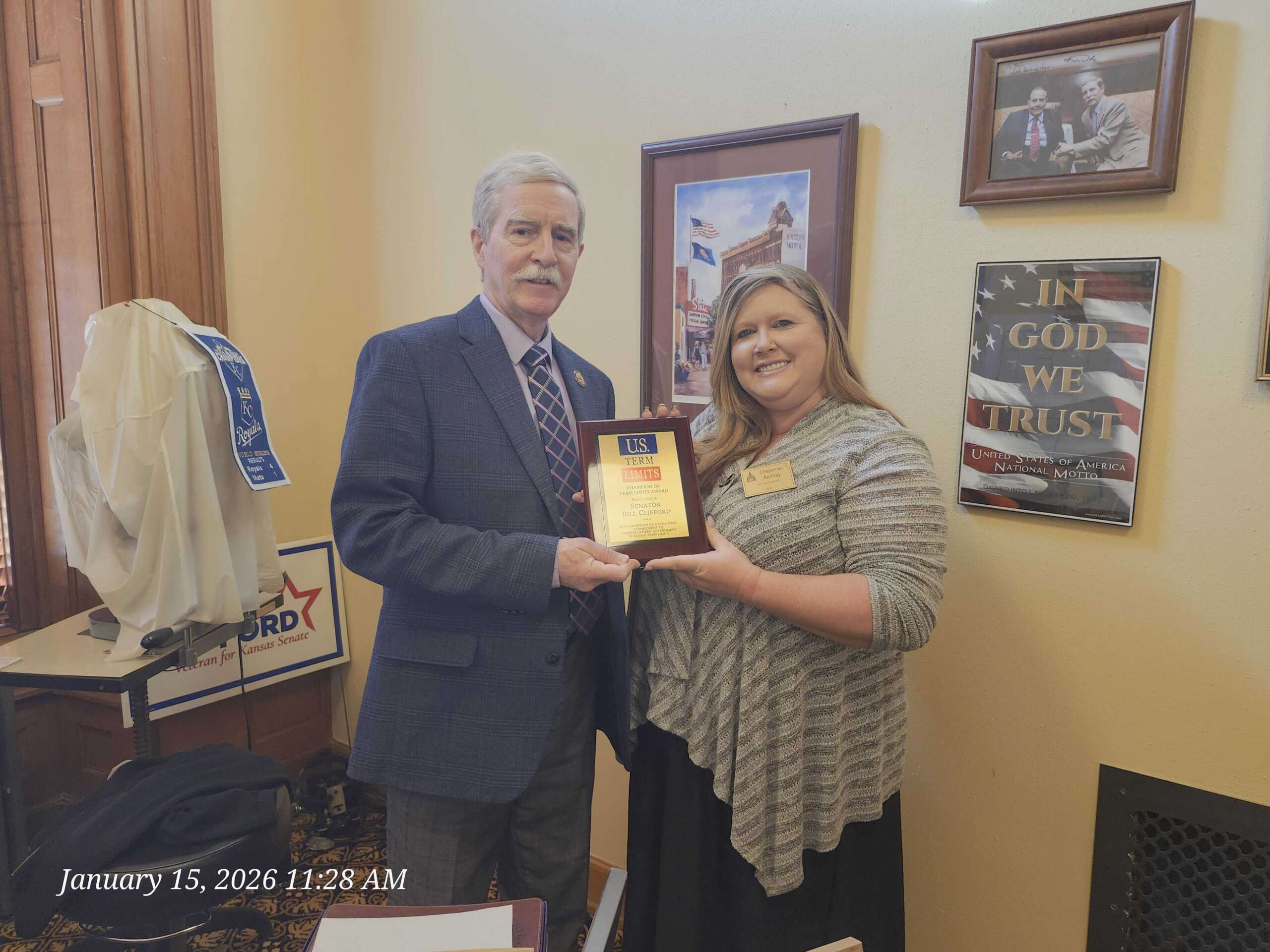 U.S. Term Limits presented Senator Bill Clifford with the “Champion of Term Limits” plaque, which reads, “In recognition of a steadfast commitment to restore citizen government through term limits.” The U.S. Term Limits Article V convention application is limited to proposing an amendment to set a limit on the number of terms that a person may be elected as a member of the U.S. House and Senate. The Article V convention application does not specify the number of terms as that will be determined by the commissioners appointed to the convention by the state legislatures.