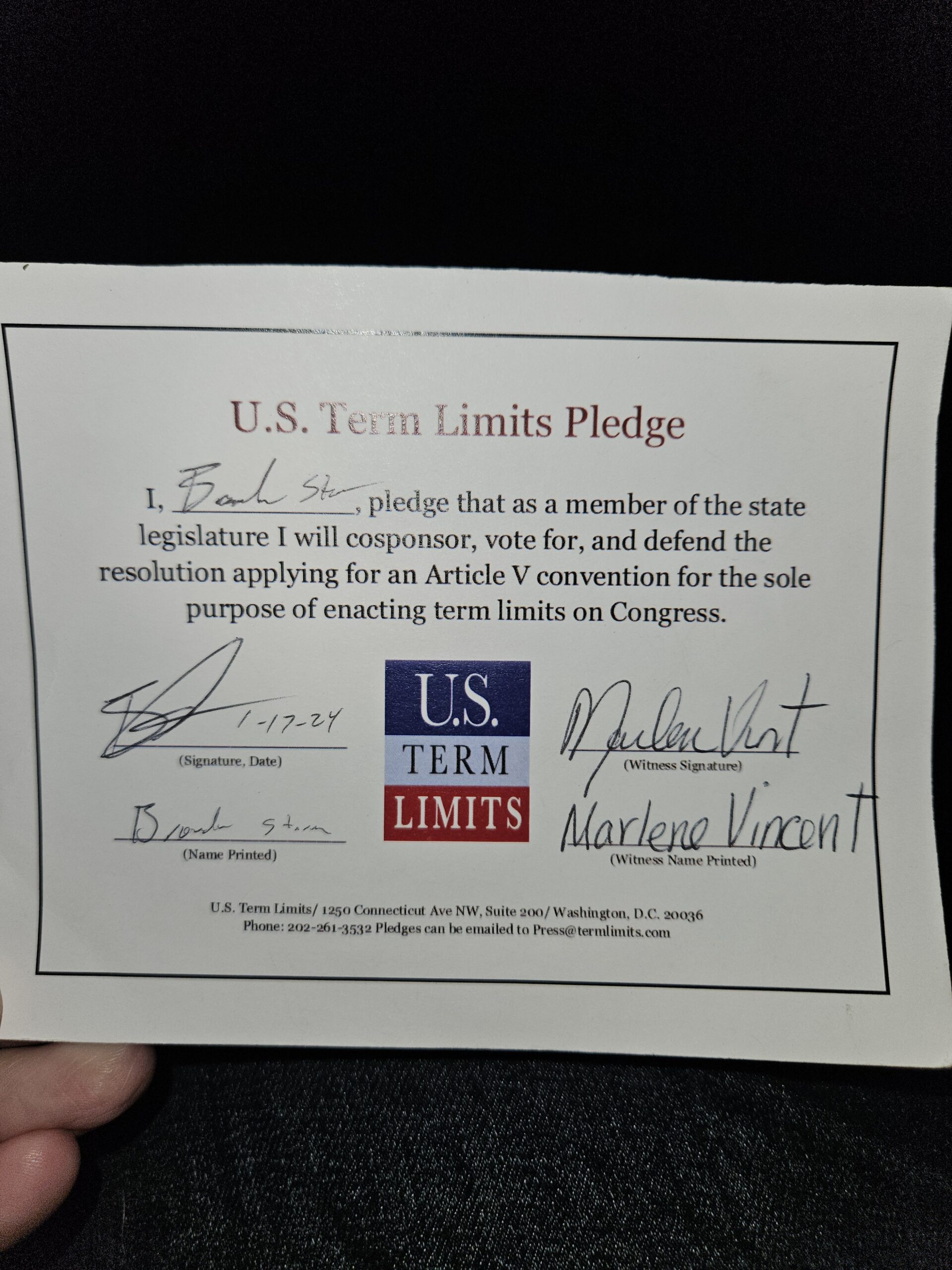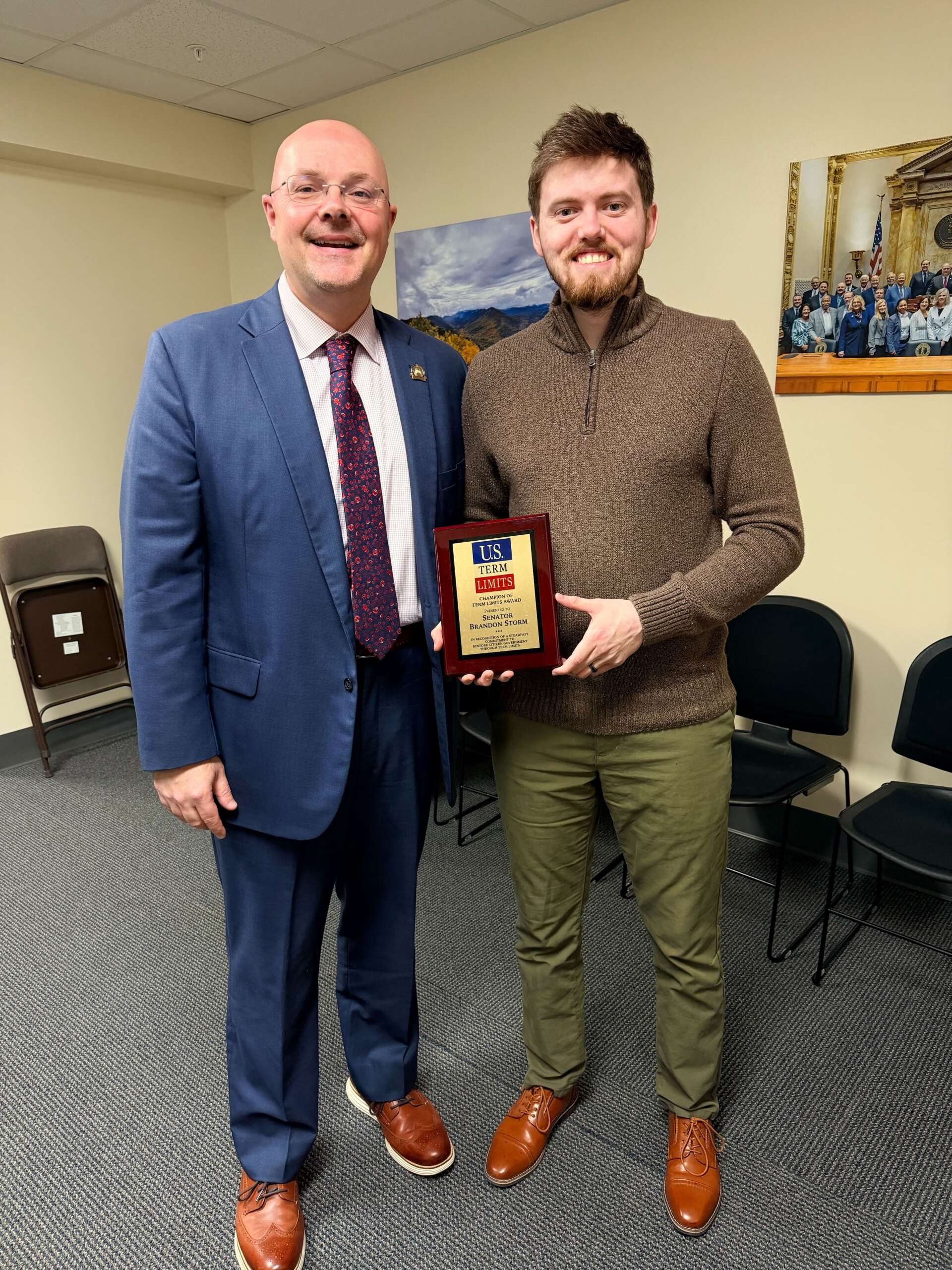Senator Brandon Storm Receives Plaque for Signing U.S. Term Limits Pledge