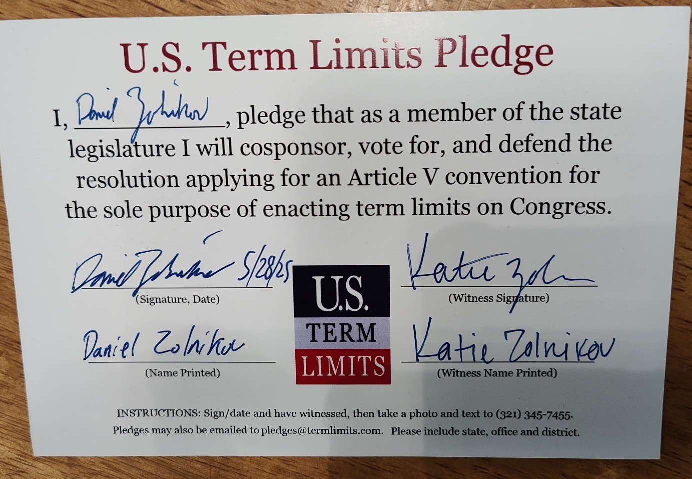 Senator Daniel Zolnikov Pledges to Support Congressional Term Limits