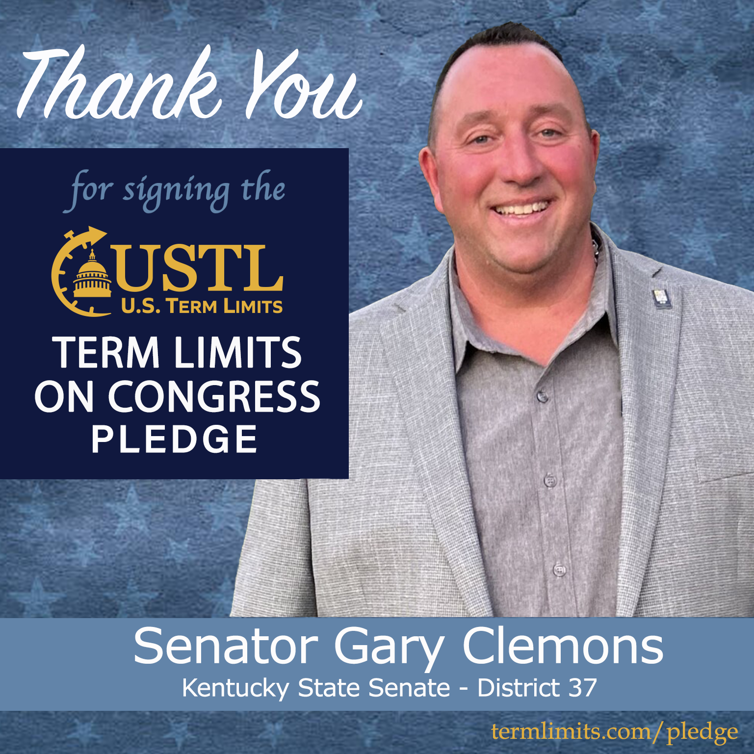 Shively, KY – U.S. Term Limits (USTL), the leader in the national, non-partisan movement to limit terms for elected officials, is gathering support from state lawmakers across the nation. Its mission is to get 34 states to apply for an amendment proposal convention specific to term limits on Congress. Kentucky state Senator Gary Clemons (district 37), has committed support for term limits on Congress by signing the term limits convention pledge.