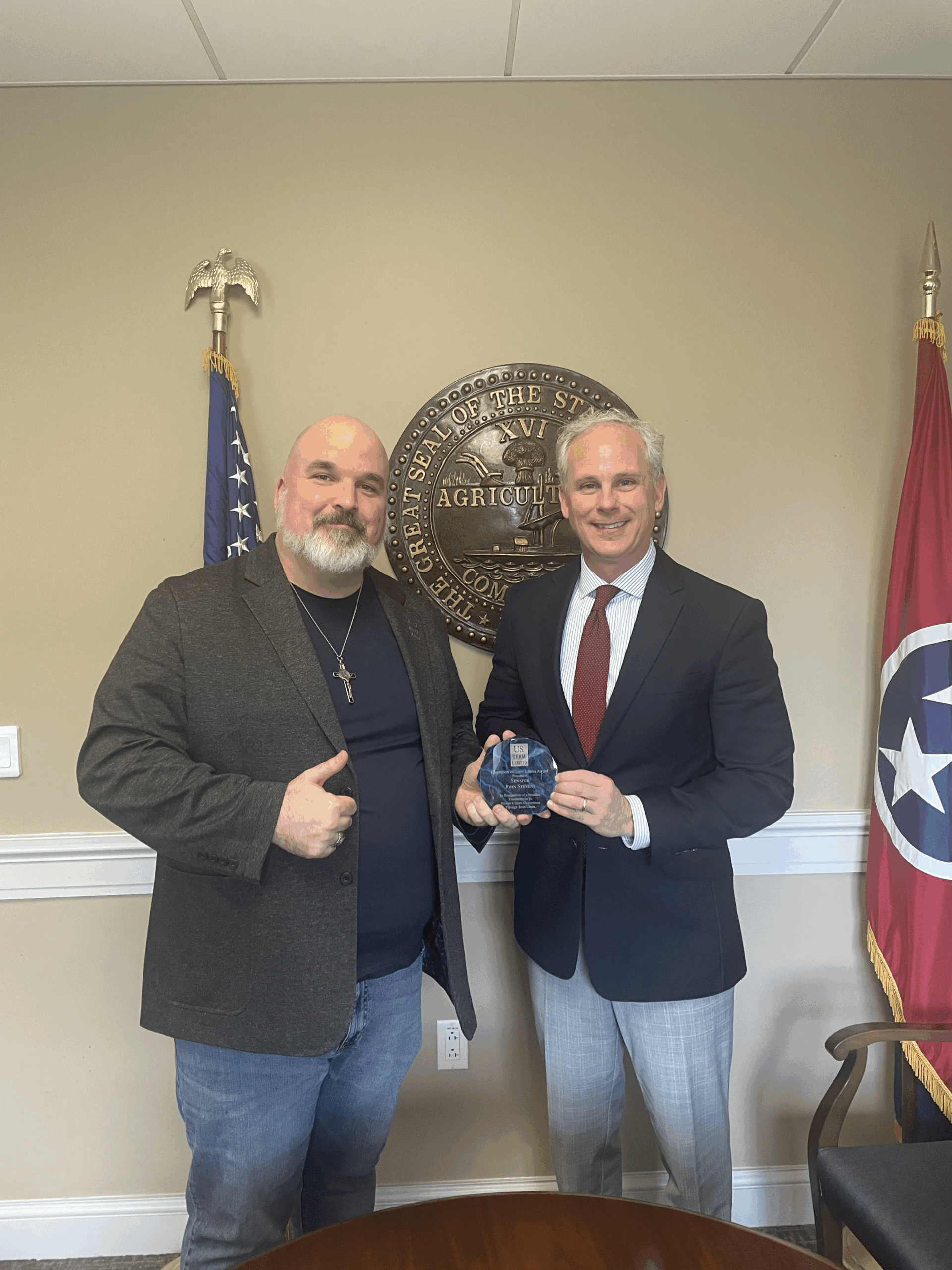 Aaron Dukette of U.S. Term Limits presented the distinction to Senator John Stevens. The “Champion of Term Limits” plaque reads, “In recognition of a steadfast commitment to restore citizen government through term limits.” Stevens pledged to support house joint resolution 5 (HJR5) which is scheduled for a committee vote next week.