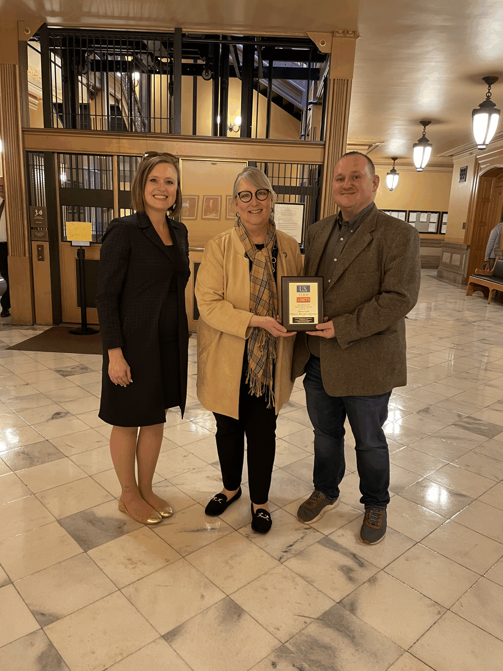 U.S. Term Limits presented Senator Molly Baumgardner with the “Champion of Term Limits” plaque, which reads, “In recognition of a steadfast commitment to restore citizen government through term limits.” The U.S. Term Limits Article V convention application is limited to proposing an amendment to set a limit on the number of terms that a person may be elected as a member of the U.S. House and Senate. The Article V convention application does not specify the number of terms as that will be determined by the commissioners appointed to the convention by the state legislatures.