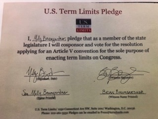 Topeka, KS —Kansas State Senator Molly Baumgardner (District 37) was recently recognized for supporting Term Limits for Congress by signing the U.S. Term Limits Pledge, which states that “as a member of the state legislature, I will cosponsor, vote for, and defend the resolution applying for an Article V convention for the sole purpose of enacting term limits on Congress.”