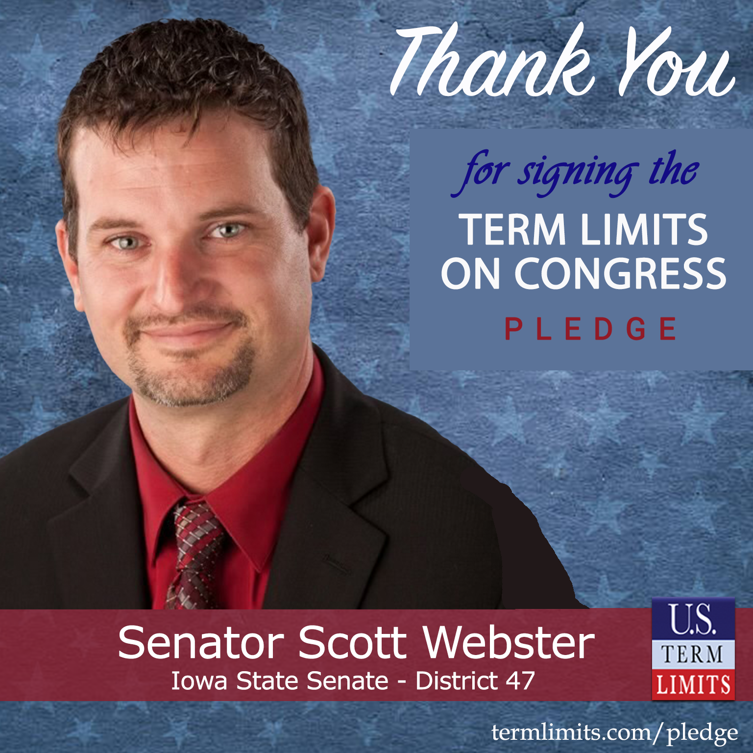 Des Moines, IA – U.S. Term Limits (USTL), the leader in the national, non-partisan movement to limit terms for elected officials, is gathering support from state lawmakers across the nation. Its mission is to get 34 states to apply for an amendment proposal convention specific to term limits on Congress. Iowa state Senator Scott Webster (District 47), has committed support for term limits on Congress by signing the term limits convention pledge.