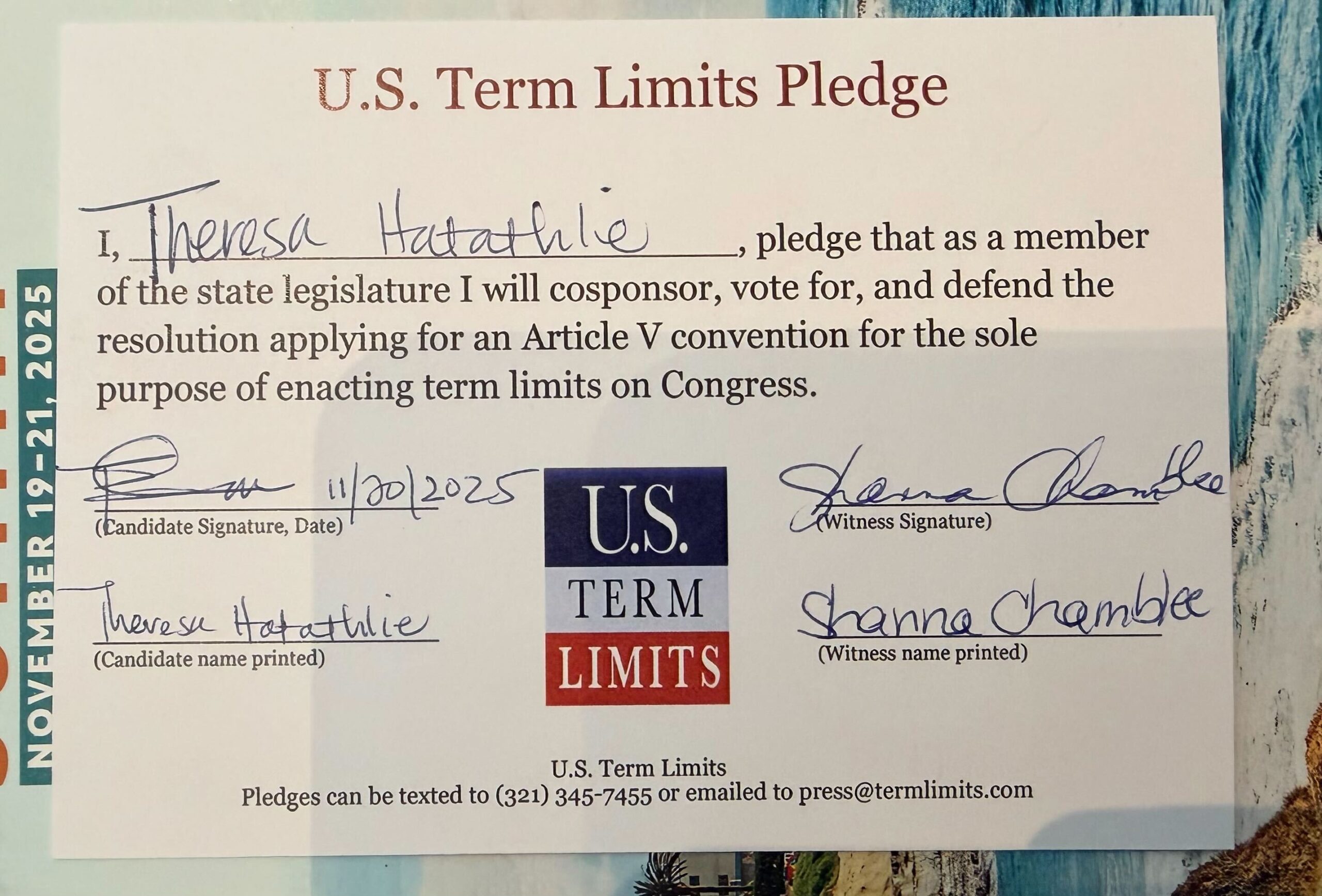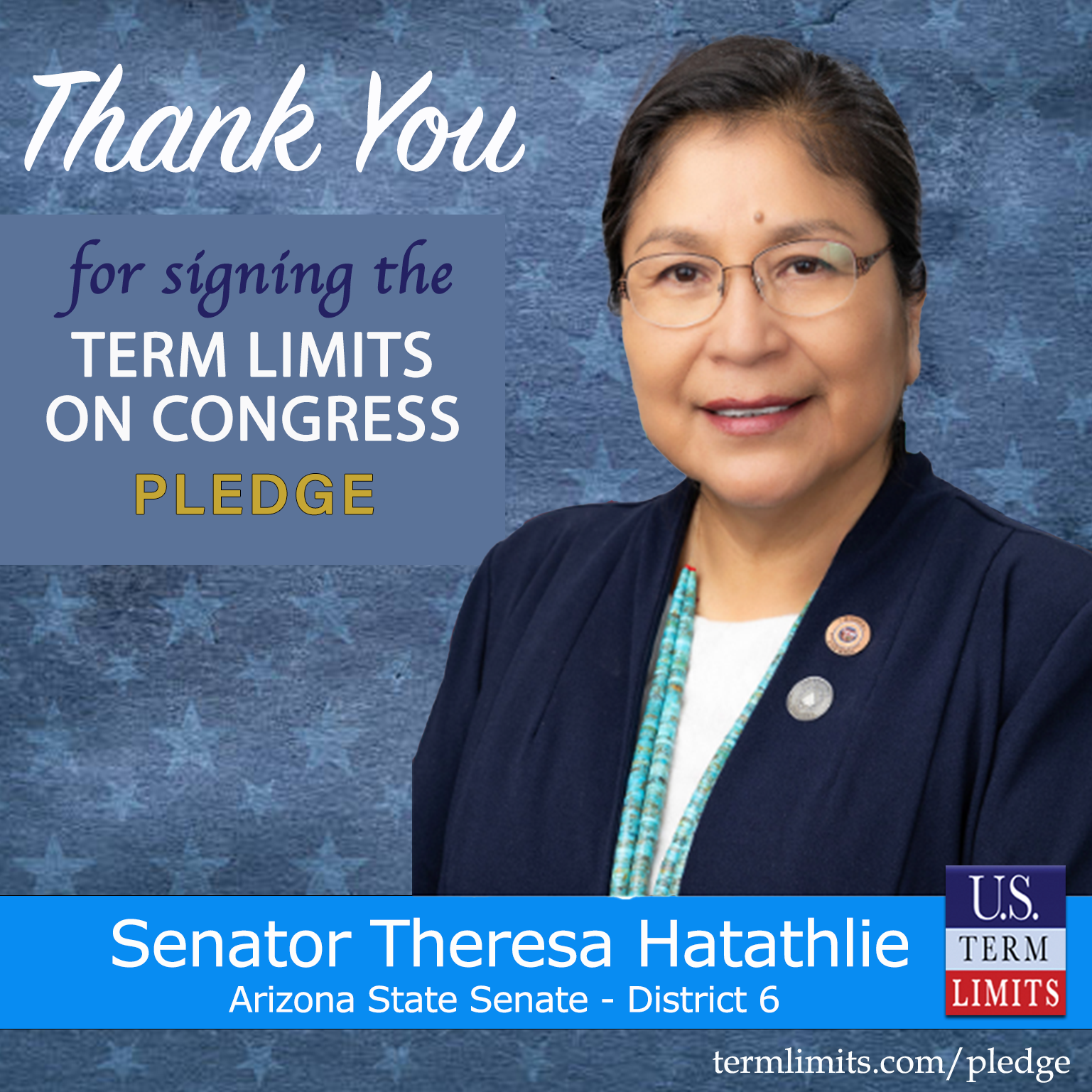Flagstaff, AZ – U.S. Term Limits (USTL), the leader in the national, non-partisan movement to limit terms for elected officials, is gathering support from state lawmakers across the nation. Its mission is to get 34 states to apply for an amendment proposal convention specific to term limits on Congress. 2025 Arizona state Senator Theresa Hatathlie (district 6), has committed support for term limits on Congress by signing the term limits convention pledge.