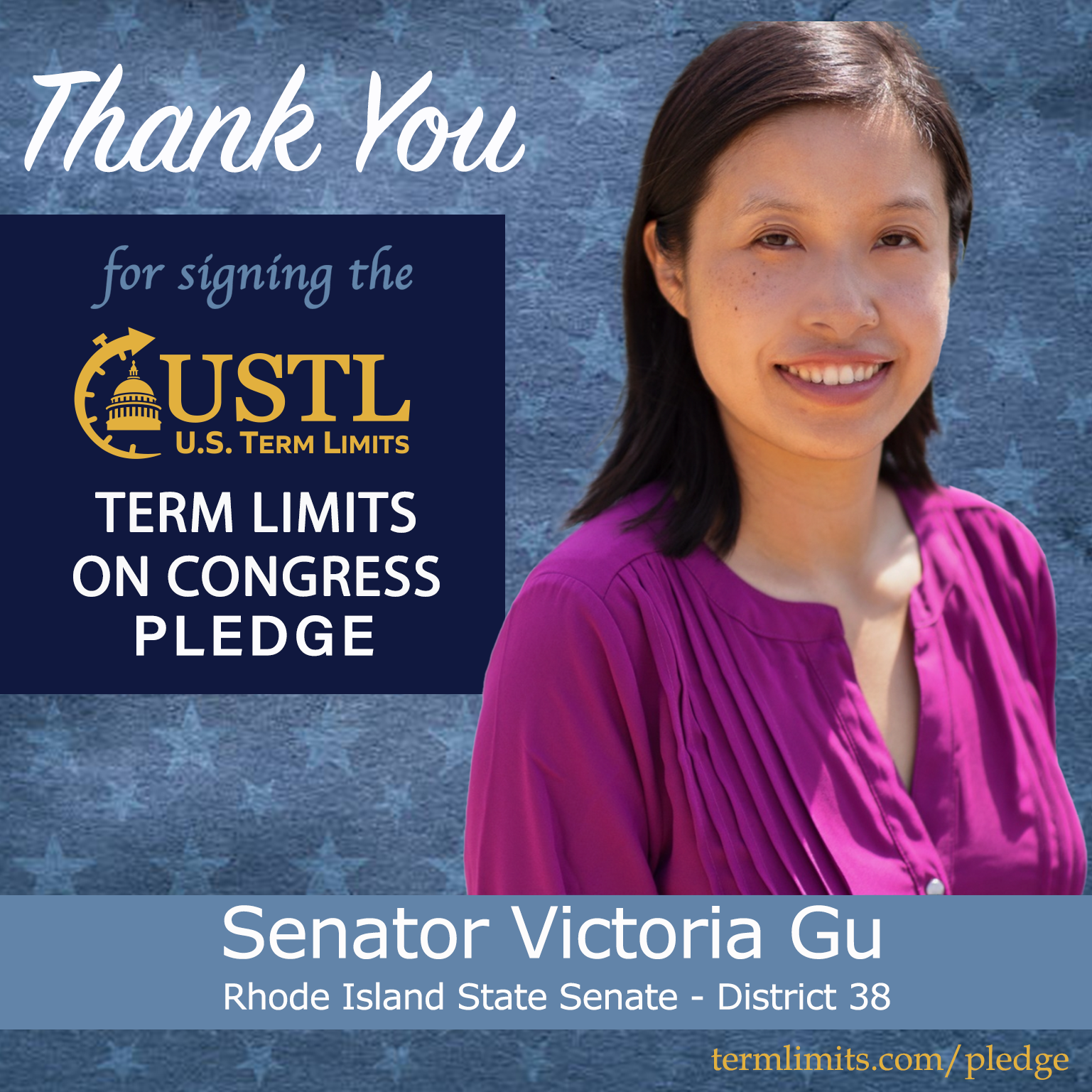 Charleston, RI – U.S. Term Limits (USTL), the leader in the national, non-partisan movement to limit terms for elected officials, is gathering support from state lawmakers across the nation. Its mission is to get 34 states to apply for an amendment proposal convention specific to term limits on Congress. Rhode Island state Senator Victoria Gu (district 38), has committed support for term limits on Congress by signing the term limits convention pledge.