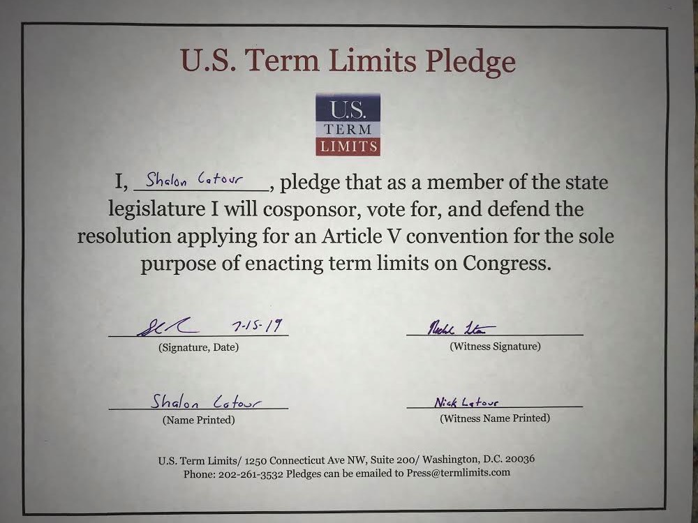 Washington, D.C. – U.S. Term Limits (USTL), the leader in the national, non-partisan movement to limit terms for elected officials, is gathering support from state lawmakers across the nation. Its mission is to get 34 states to apply for an amendment proposal convention specific to term limits on Congress. Louisiana state house candidate, Shalon Latour (district 37) has committed support for term limits on Congress by signing the Term Limits Convention pledge.