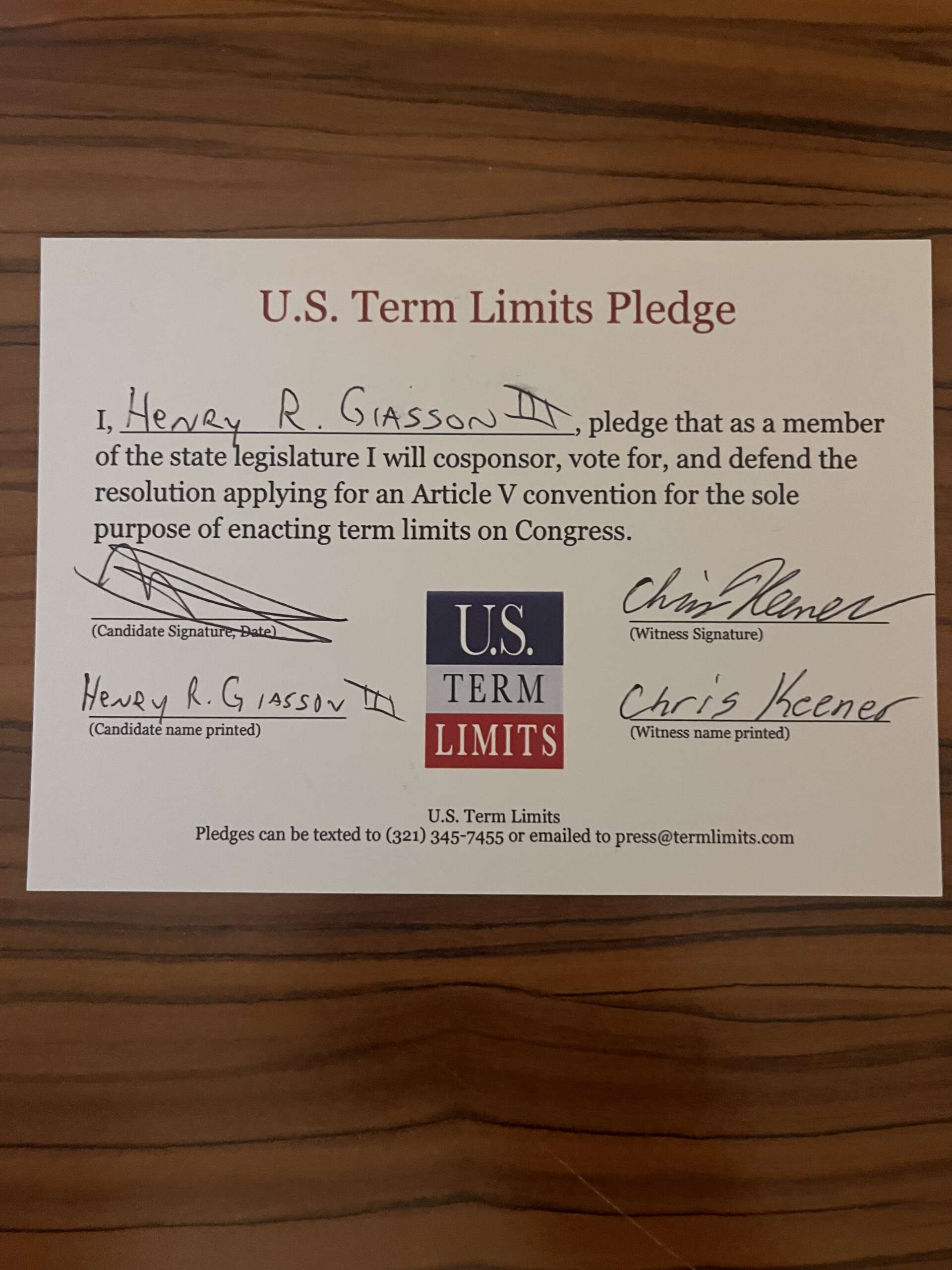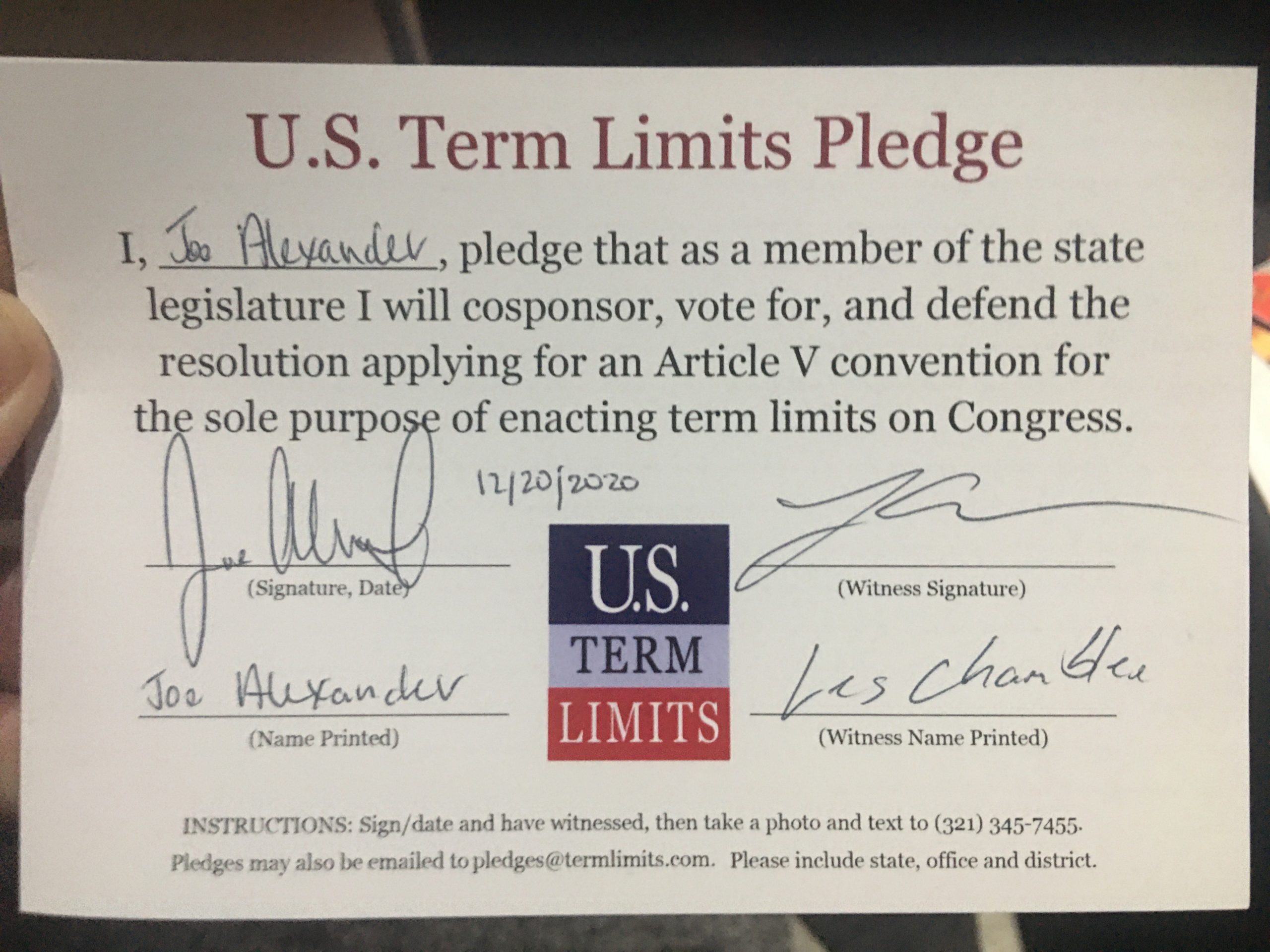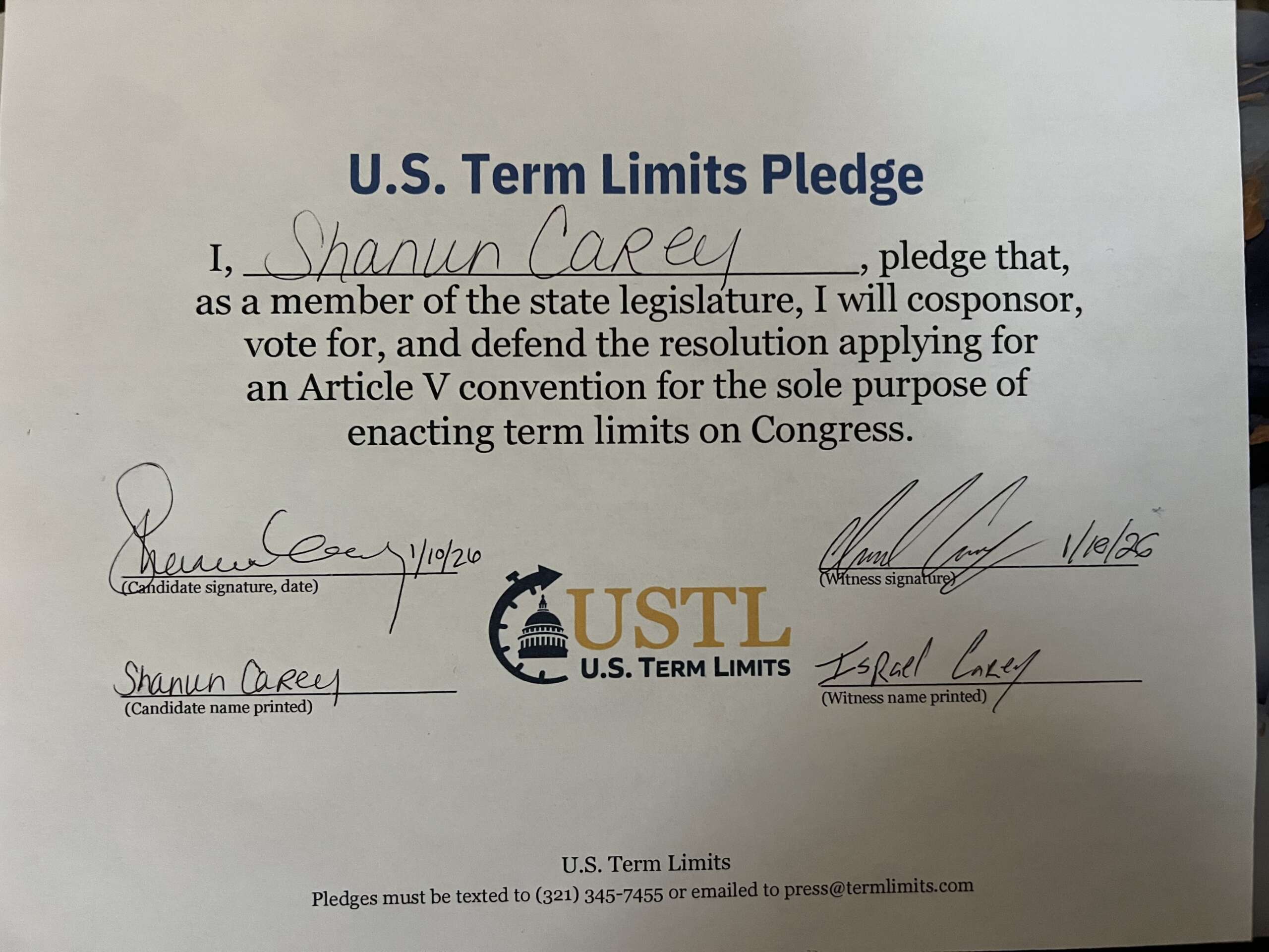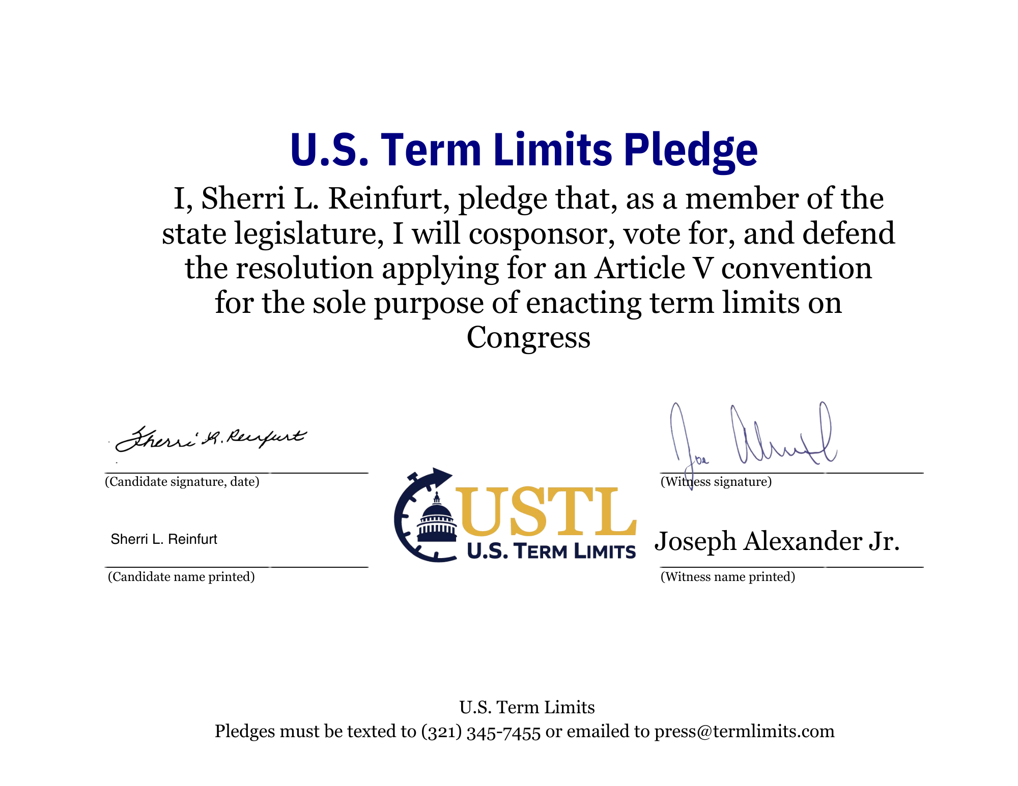 The U.S. Term Limits pledge is provided to candidates and members of state legislatures. It reads, “I pledge that, as a member of the state legislature, I will cosponsor, vote for, and defend the resolution applying for an Article V convention for the sole purpose of enacting term limits on Congress.”