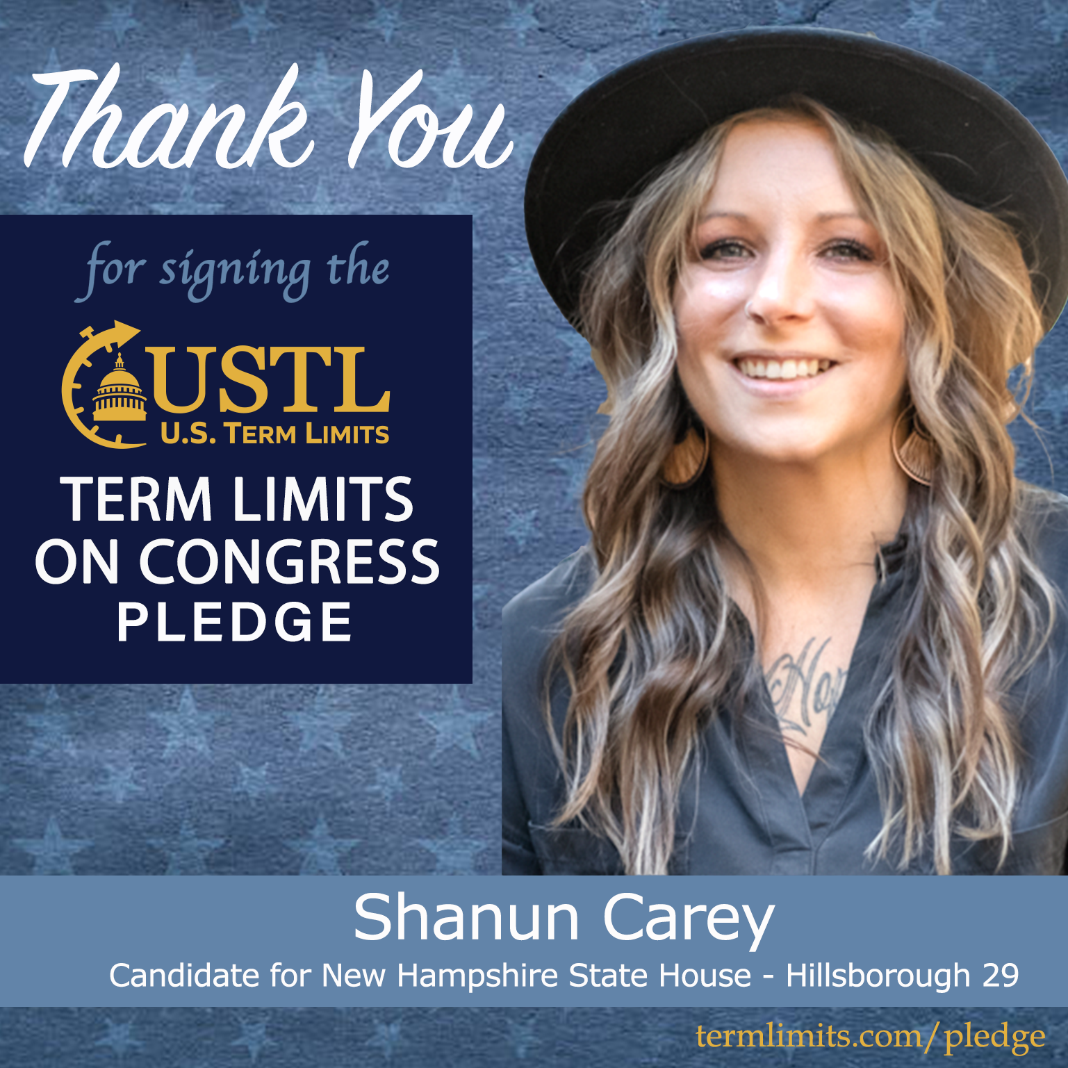 Goffstown, NH – U.S. Term Limits (USTL), the leader in the national, non-partisan movement to limit terms for elected officials, is gathering support from state lawmakers across the nation. Its mission is to get 34 states to apply for an amendment proposal convention specific to term limits on Congress. New Hampshire state house candidate, Shanun Carey (Hillsborough 29), has committed support for term limits on Congress by signing the term limits convention pledge. Previously incumbent Reps. Henry Giasson, Joe Alexander and Sherri Reinfurt also signed the pledge.