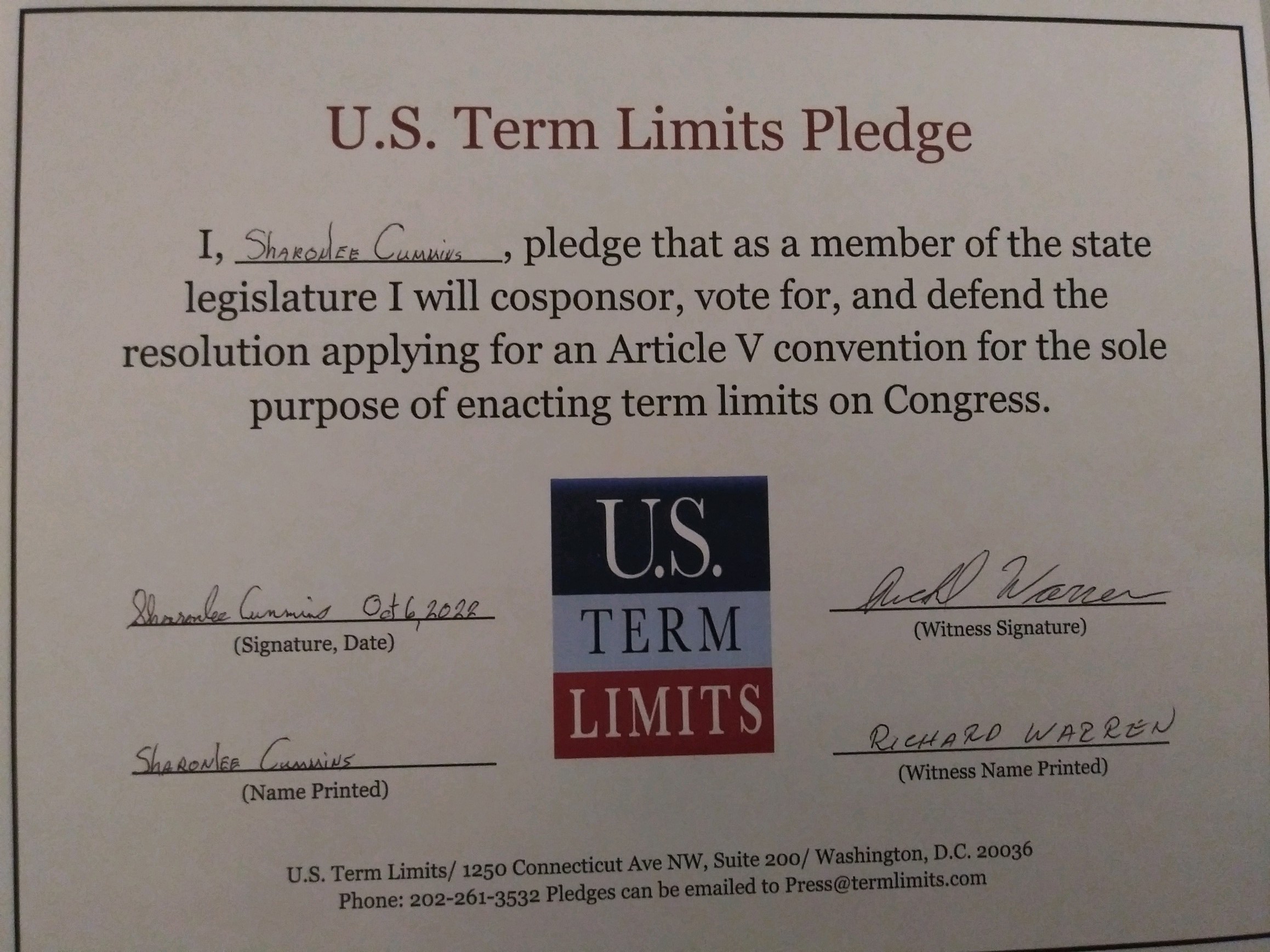 Sharonlee Cummins Pledges to Support Congressional Term Limits