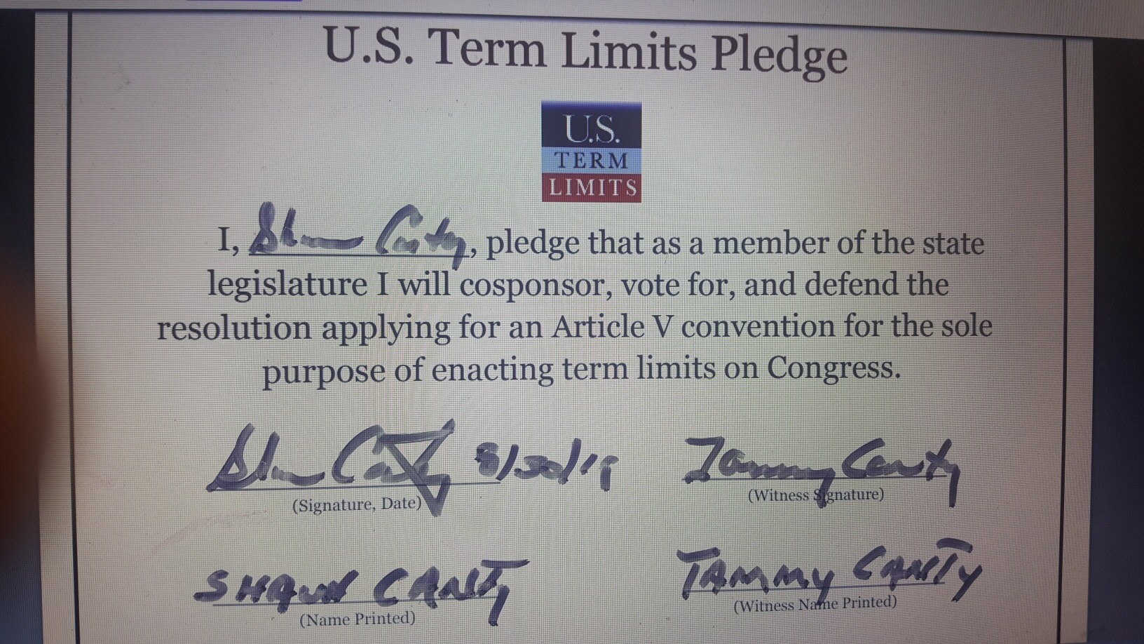 The U.S. Term Limits pledge is provided to candidates and members of state legislatures. It reads, “I pledge that, as a member of the state legislature, I will cosponsor, vote for, and defend the resolution applying for an Article V convention for the limited purpose of enacting term limits on Congress.”