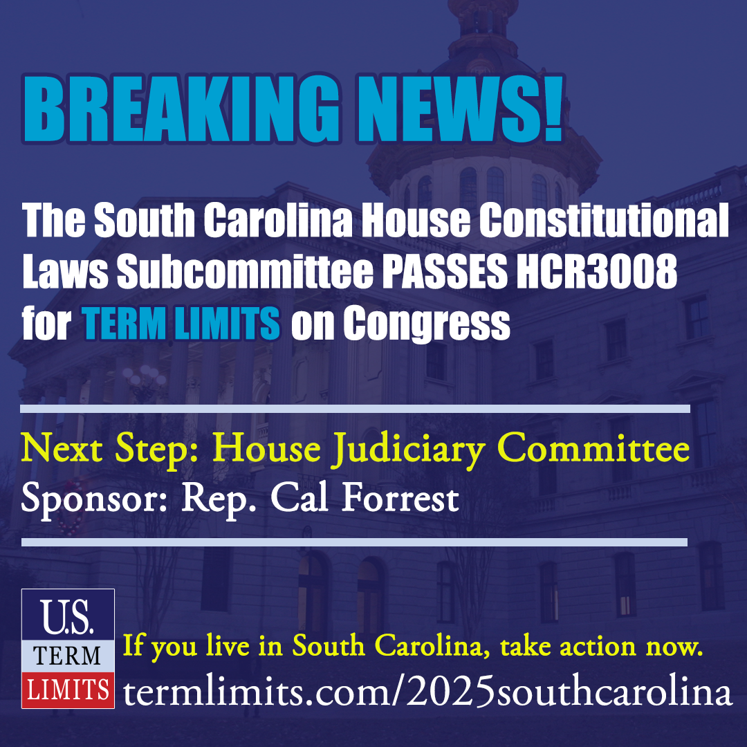 HCR3008 has bipartisan sponsorship and the support of more than 50 legislators who have signed the term limits pledge, promising to support the congressional term limits effort. The next step will be a vote in the house judiciary committee. Once the measure passes in both chambers, South Carolina will be in the forefront of the states in the nation to file an application for a convention with the exclusive purpose of proposing term limits on the U.S. Congress.