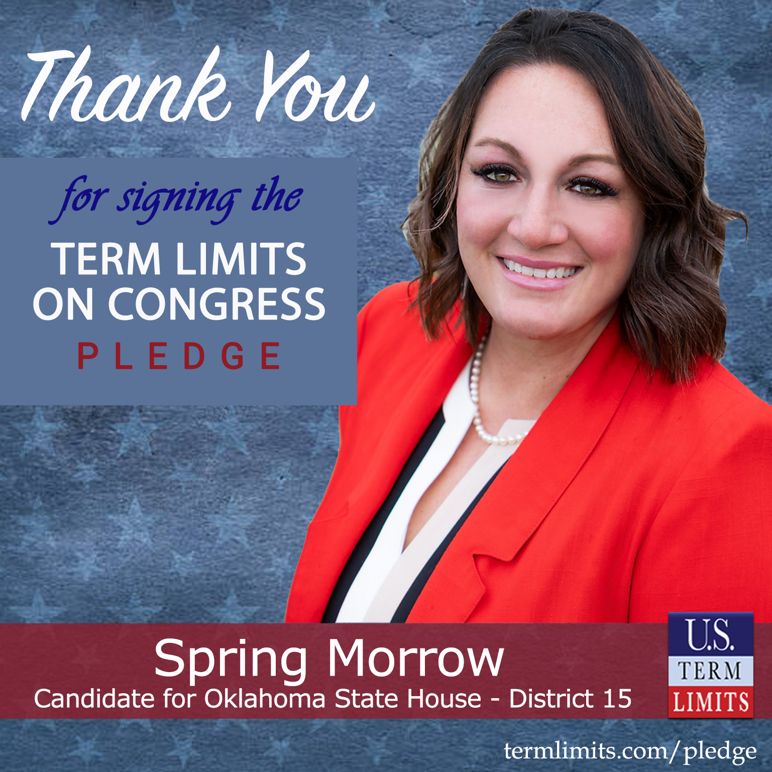 Stigler, OK– U.S. Term Limits (USTL), the leader in the national, non-partisan movement to limit terms for elected officials, is gathering support from state lawmakers across the nation. Its mission is to get 34 states to apply for an amendment proposal convention specific to term limits on Congress. Oklahoma state house candidate, Spring Morrow (District 15), has committed support for term limits on Congress by signing the term limits convention pledge. Previously, candidates Tim Turner and Paul Palmer also signed the pledge.