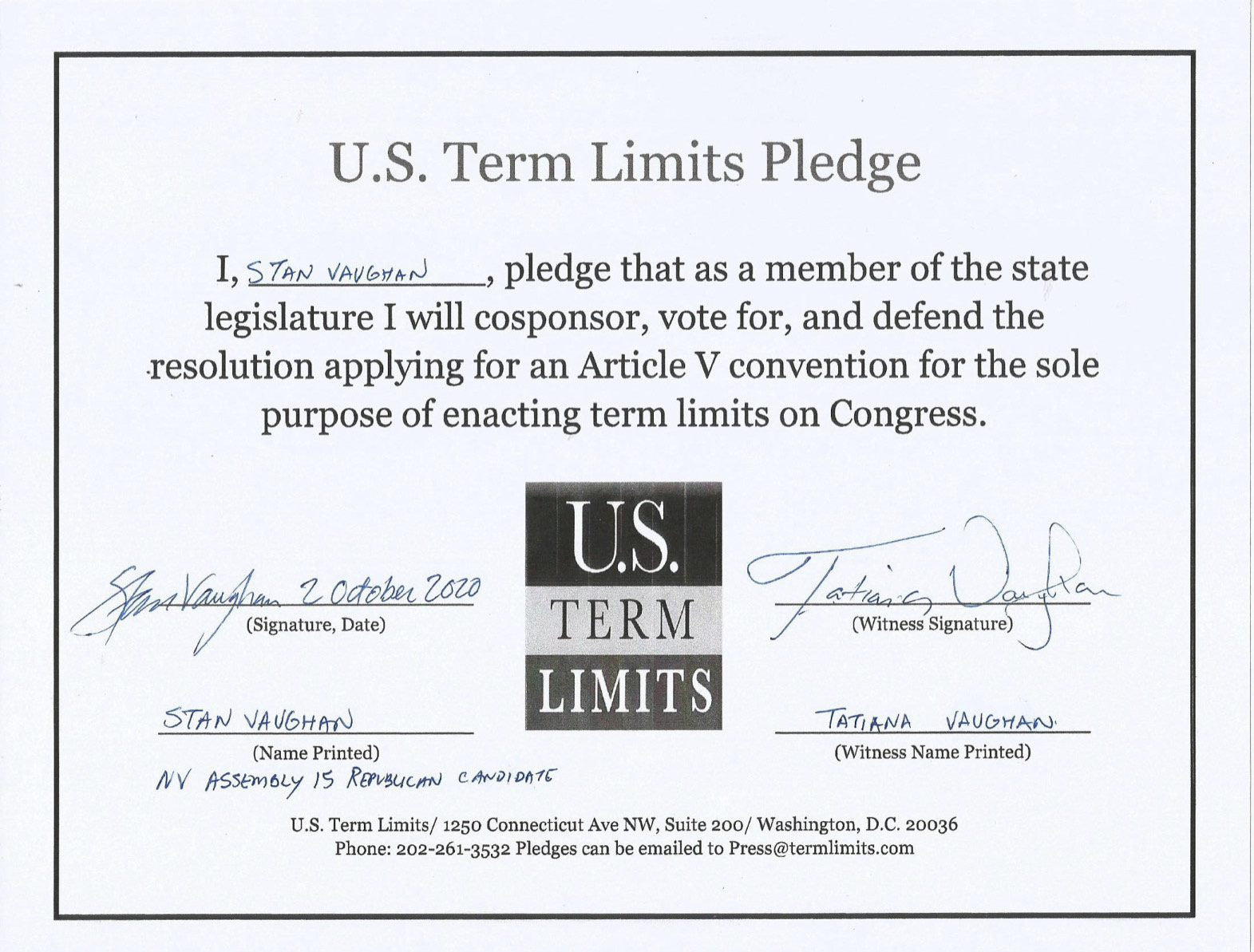 Washington, D.C. – U.S. Term Limits (USTL), the leader in the national, non-partisan movement to limit terms for elected officials, is gathering support from state lawmakers across the nation. Its mission is to get 34 states to apply for an amendment proposal convention specific to term limits on Congress. Nevada state assembly candidate, Stan Vaughan (district 15), has committed support for term limits on Congress by signing the Term Limits Convention pledge.