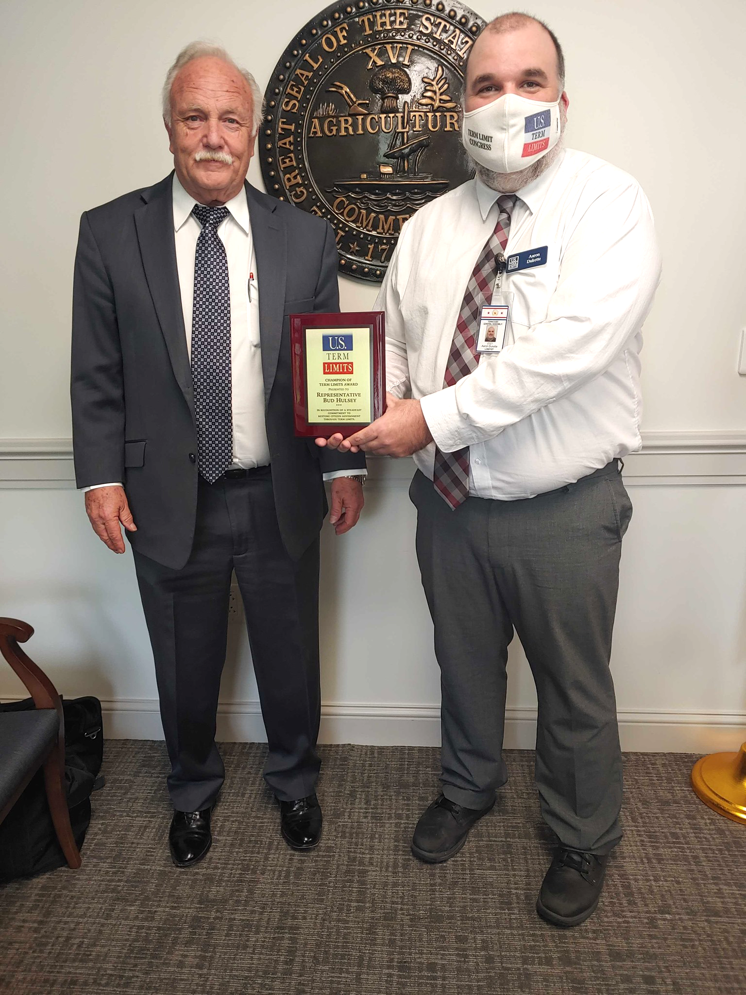 Nashville, TN — Tennessee’s state representative Bud Hulsey (district 2) was honored with a plaque for his support of term limits on Congress. U.S. Term Limits (USTL), the nation’s oldest and largest pro-term limits group, presented the distinction to Hulsey at the Tennessee capitol earlier this week.