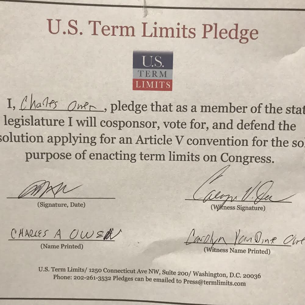 Shanna Chamblee of USTL gave the representative the “Champion of Term Limits” wood plaque which reads, “In recognition of a steadfast commitment to restore citizen government through term limits.” Owen has pledged to support house concurrent resolution 51 (HCR51) which is slated to go to a vote on the house floor next week. The convention bill does not set the specific length of term limits, rather, it simply starts a discussion among the states on what the ideal term limits of Congressmembers should be.