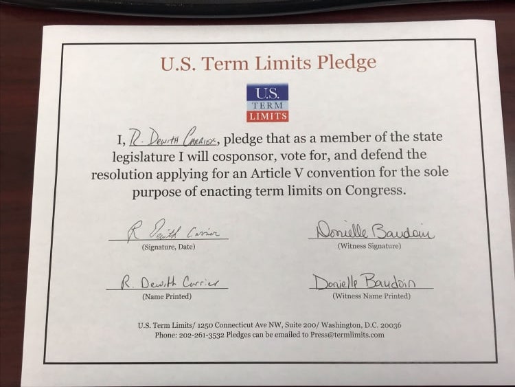 Les and Shanna Chamblee of USTL gave the representative the “Champion of Term Limits” wood plaque which reads, “In recognition of a steadfast commitment to restore citizen government through term limits.” Carrier has pledged to support house concurrent resolution 51 (HCR51) which is slated to go to a vote on the house floor next week. The convention bill does not set the specific length of term limits, rather, it simply starts a discussion among the states on what the ideal term limits of Congressmembers should be.