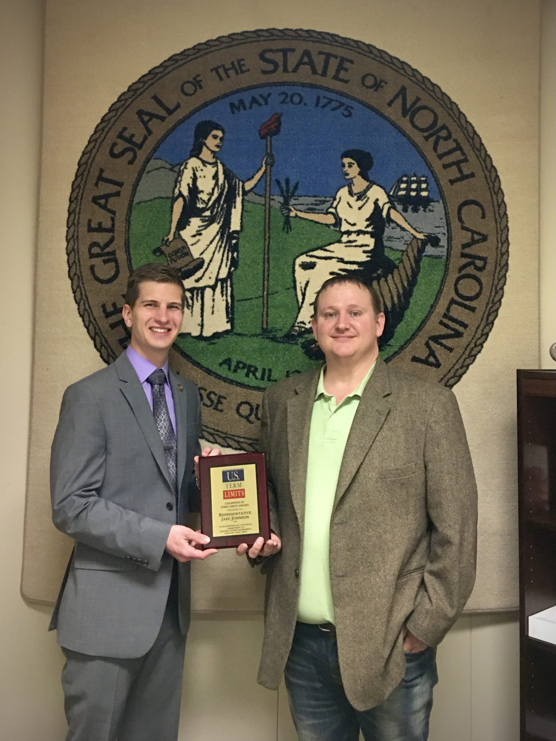 Raleigh, NC — North Carolina’s state representative Jake Johnson (district 113) was honored with a plaque for his support of term limits on Congress. U.S. Term Limits (USTL), the nation’s oldest and largest pro-term limits group, presented the distinction to Johnson at the North Carolina capitol earlier this week.