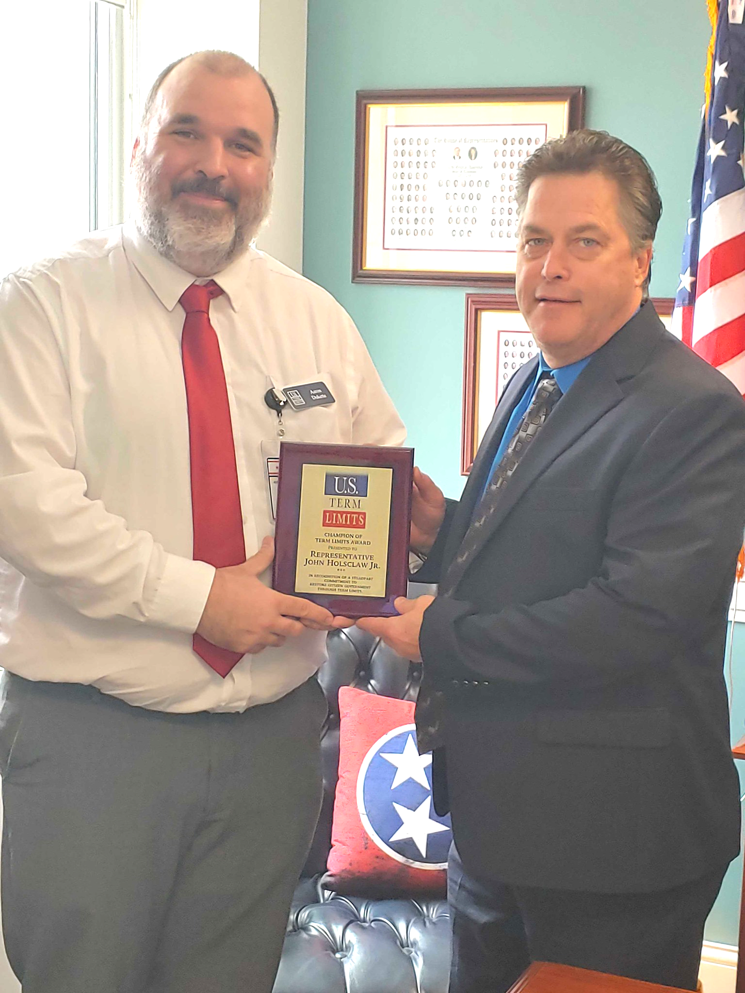 Nashville, TN — Tennessee’s state representative John Holsclaw(district 4) was honored with a plaque for his support of term limits on Congress. U.S. Term Limits (USTL), the nation’s oldest and largest pro-term limits group, presented the distinction to Holsclaw at the Tennessee capitol earlier this week.