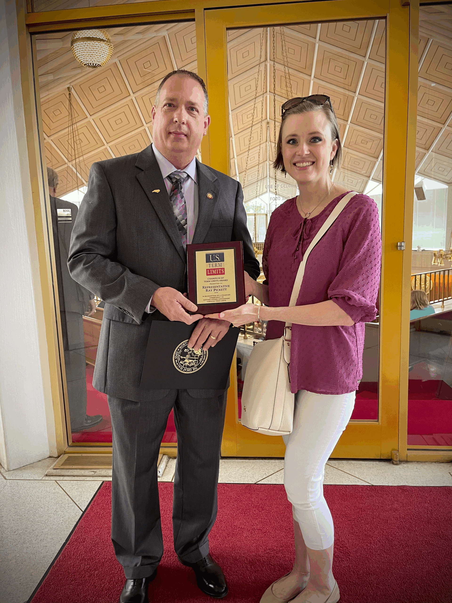 Raleigh, NC — North Carolina’s state representative Ray Pickett (district 93) was honored with a plaque for his support of term limits on Congress. U.S. Term Limits (USTL), the nation’s oldest and largest pro-term limits group, presented the distinction to Pickett at the North Carolina capitol earlier this week.
