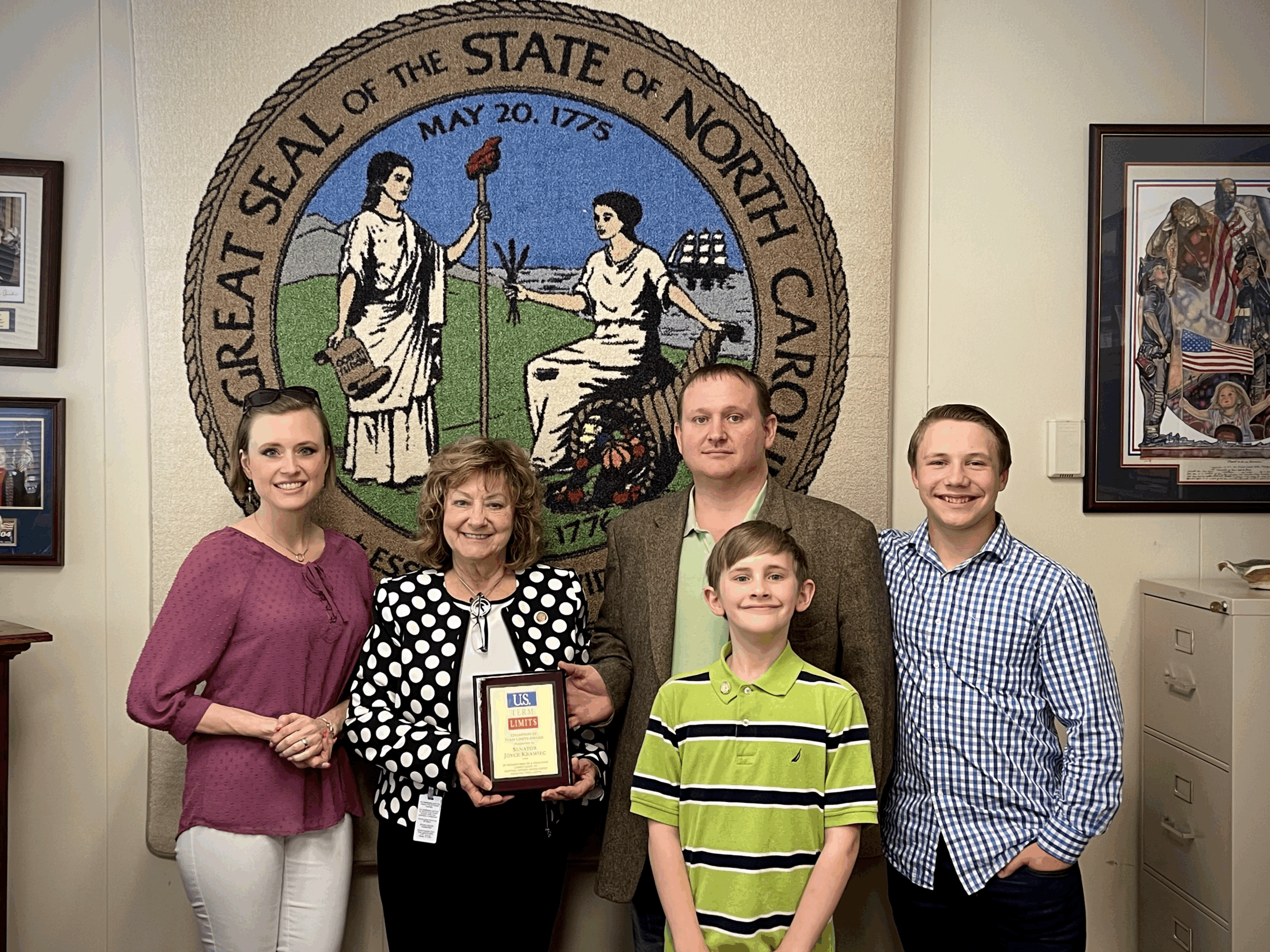Raleigh, NC — North Carolina’s state senator Joyce Krawiec (district 31) was honored with a plaque for her support of term limits on Congress. U.S. Term Limits (USTL), the nation’s oldest and largest pro-term limits group, presented the distinction to Krawiec at the North Carolina capitol earlier this week.