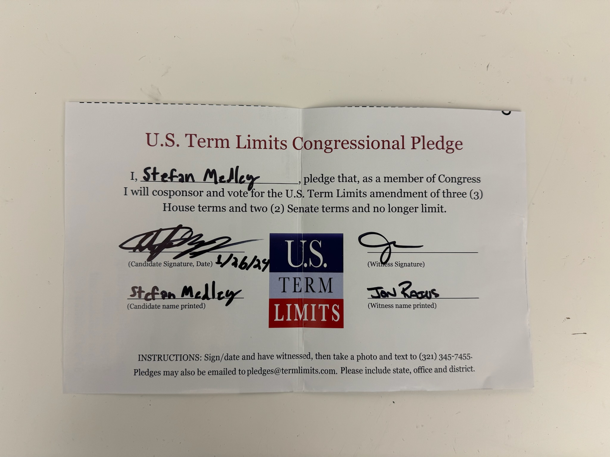 U.S. Term Limits has the support of 130 pledge signers in Congress. USTL President Philip Blumel commented on Medley’s pledge saying, “Stefan’s strong support of term limits shows that there are individuals who are willing to put self-interest aside to follow the will of the people. America needs a Congress that will be served by citizen legislators, not career politicians.”