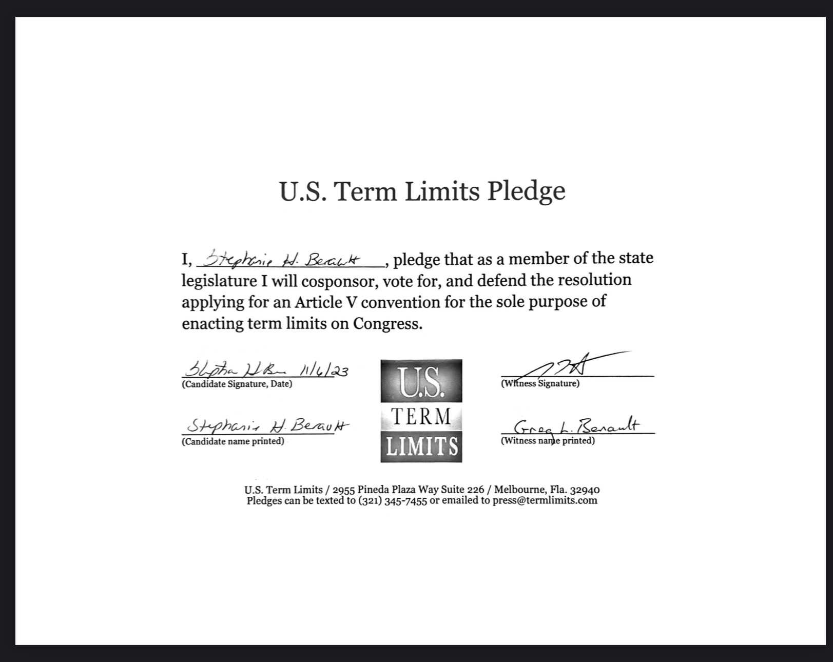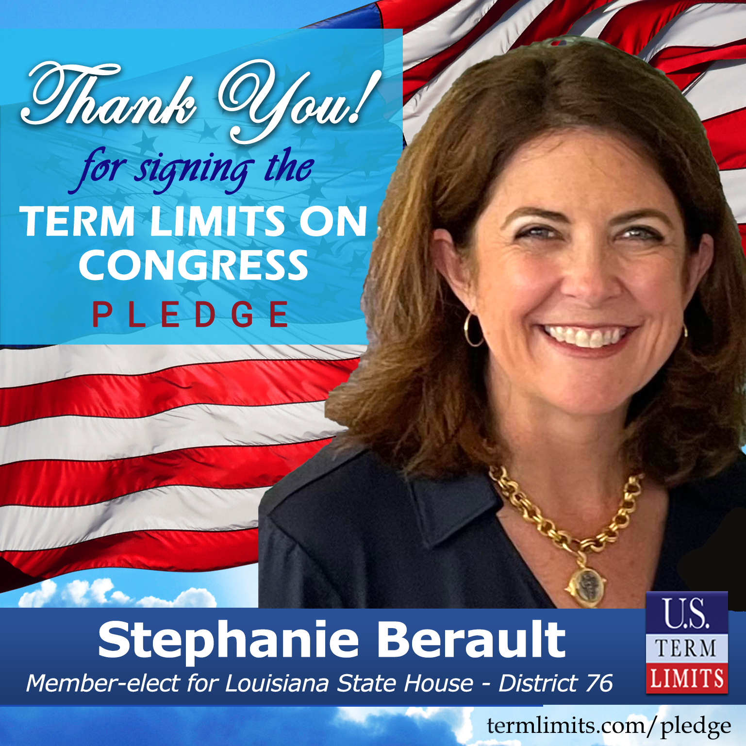 USTL President, Philip Blumel, commented on Berault’s pledge saying, “Stephanie’s strong support of term limits shows that there are individuals who are willing to listen to the majority of voters who want term limits. America needs a Congress that will be served by citizen legislators, not career politicians.”