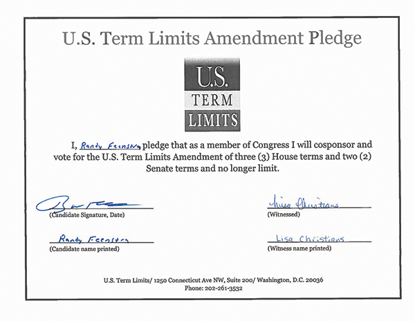 The U.S. Term Limits amendment pledge is provided to every announced candidate for federal office. It reads, “I pledge that as a member of Congress, I will cosponsor and vote for the U.S. Term Limits amendment of three (3) two-year House terms and two (2) six-year Senate terms and no longer limit.”