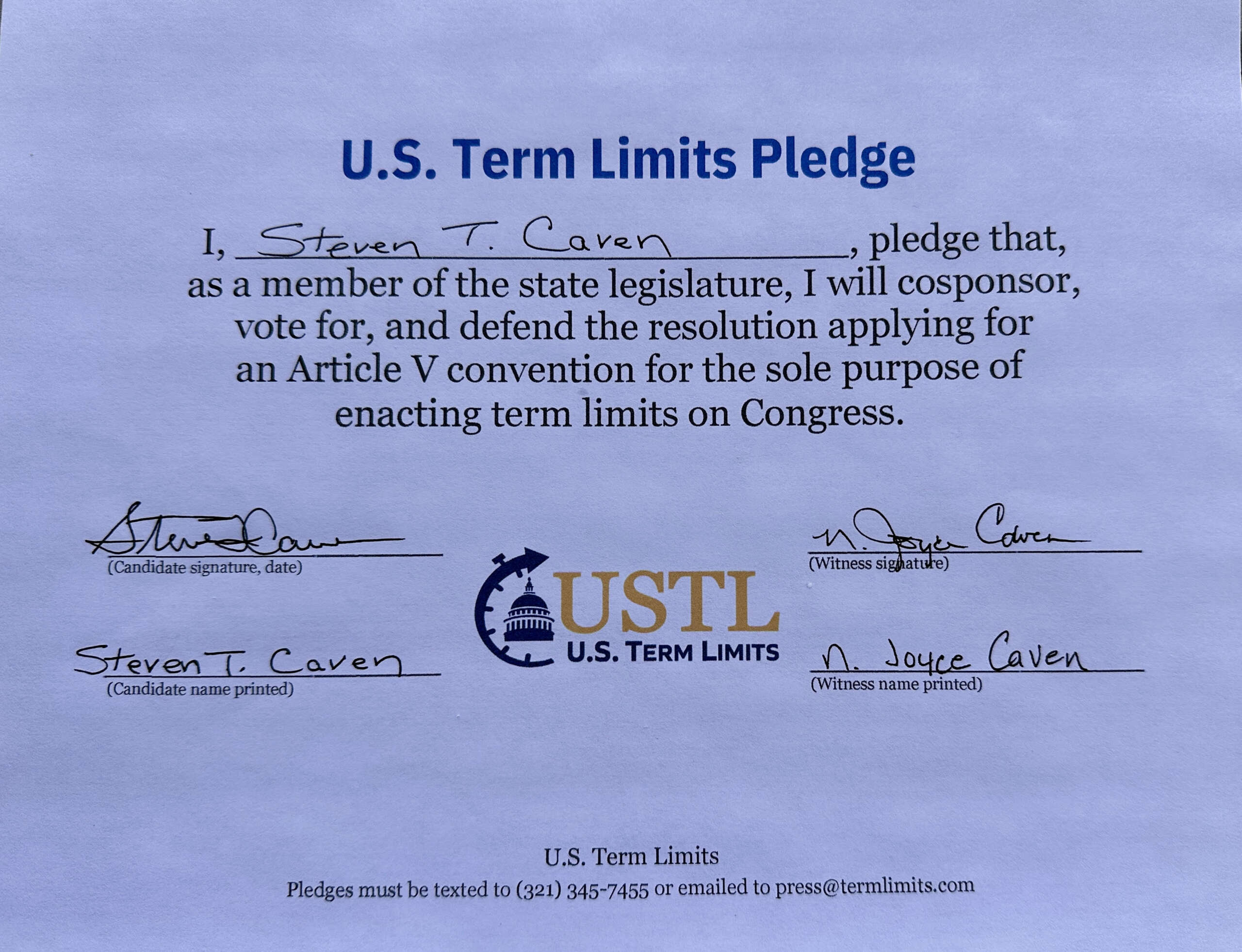 Bonnieville, KY – U.S. Term Limits (USTL), the leader in the national, non-partisan movement to limit terms for elected officials, is gathering support from state lawmakers across the nation. Its mission is to get 34 states to apply for an amendment proposal convention specific to term limits on Congress. 2026 Kentucky state house candidate, Steve Caven (district 24), has committed support for term limits on Congress by signing the term limits convention pledge. Previously, incumbent Rep. Ryan Bivens and candidate Johnny Pennington also signed.